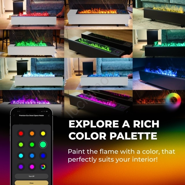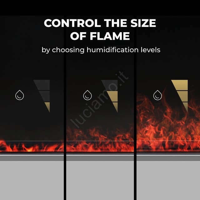 • Il dispositivo può essere controllato tramite un'app smart via Wi-Fi, con timer, impostazioni di riscaldamento e selezione del colore dell'effetto.