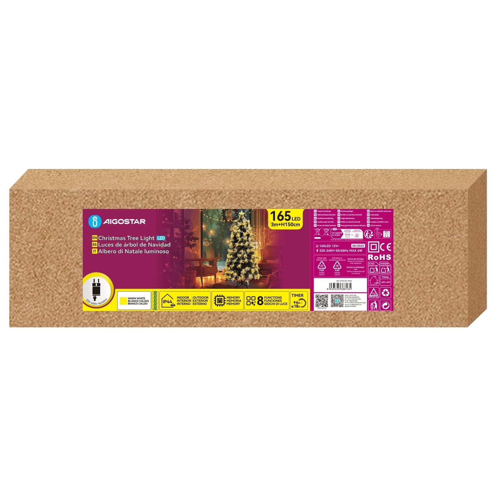 Aigostar - Albero di Natale LED da esterno, 165 LED, 8 funzioni, 1,5 m, IP44, bianco caldo