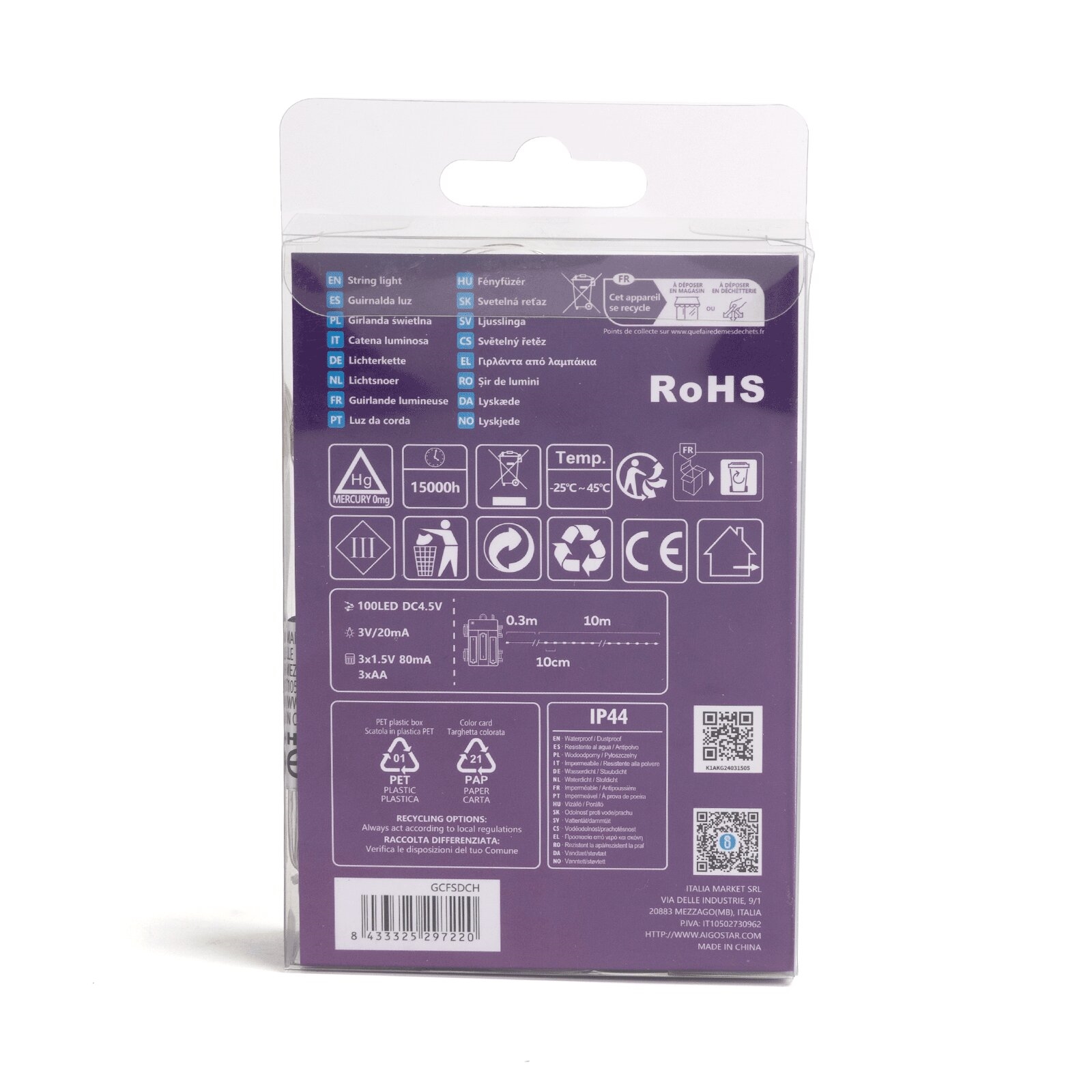• Aigostar -LED Catena luminosa da esterno 100xLED/8 funzioni 3xAA 10,3m IP44 bianco caldo