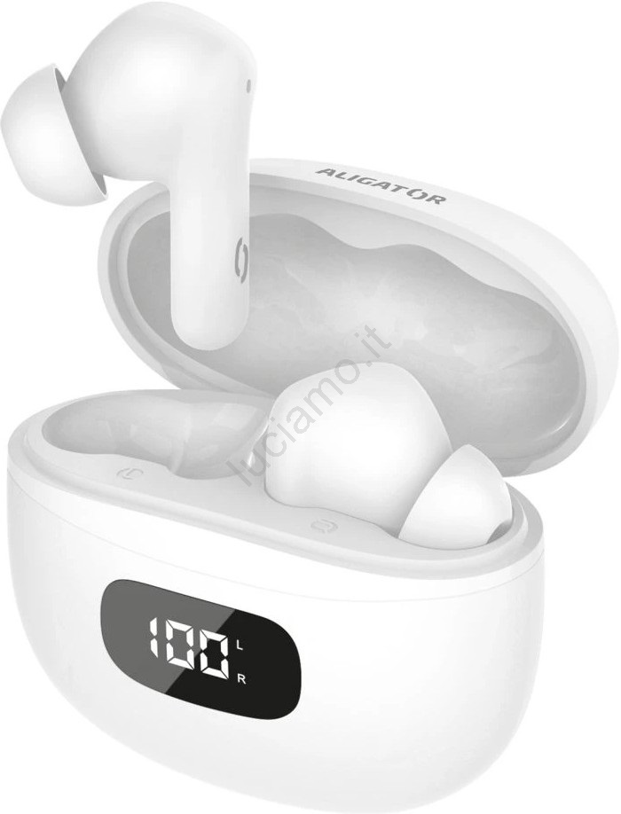 Aligator TWS08WT - Auricolari True Wireless con ANC (cancellazione attiva del rumore), batteria da 200 mAh + 2x 30 mAh, IP40, bianchi