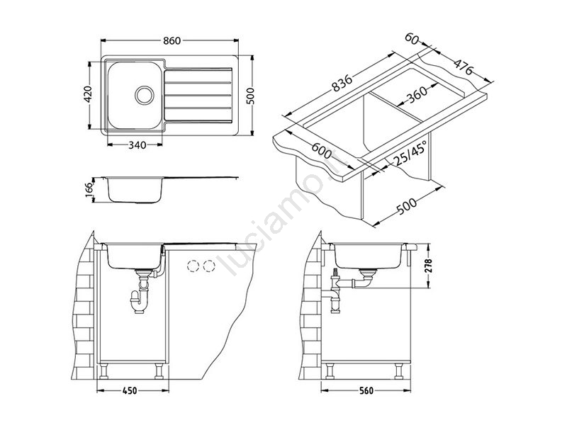 • Contenuto della confezione: lavello in acciaio inox, staffe di fissaggio e guarnizione, scarico con cestello 3 1/2, sifone con derivazione per lavastoviglie.