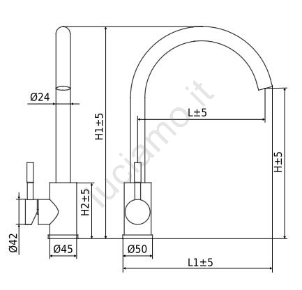 • Rubinetto da cucina monocomando ad alta pressione con braccio girevole.