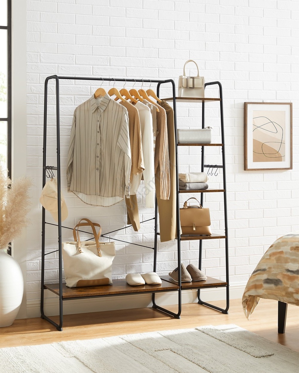 • Appendi giacche, camicie e pantaloni sulla barra superiore per tutta la sua lunghezza; sui 5 ripiani portaoggetti riponi borse, scarpe, scatole,  cappelli, sciarpe, ombrelli e altri oggetti necessari.
