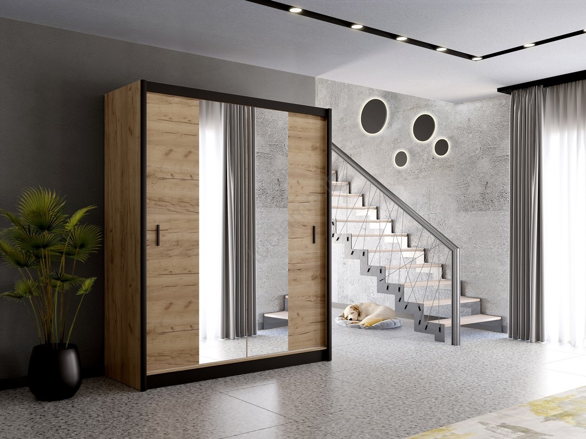 • Armadio con specchio SANTINO 203x215 cm quercia craft/nero