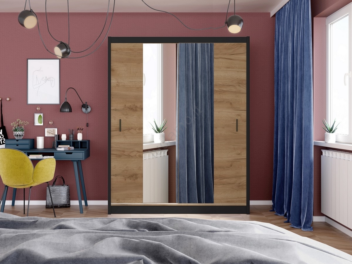 • Armadio con specchio SANTINO 203x215 cm nero/quercia craft