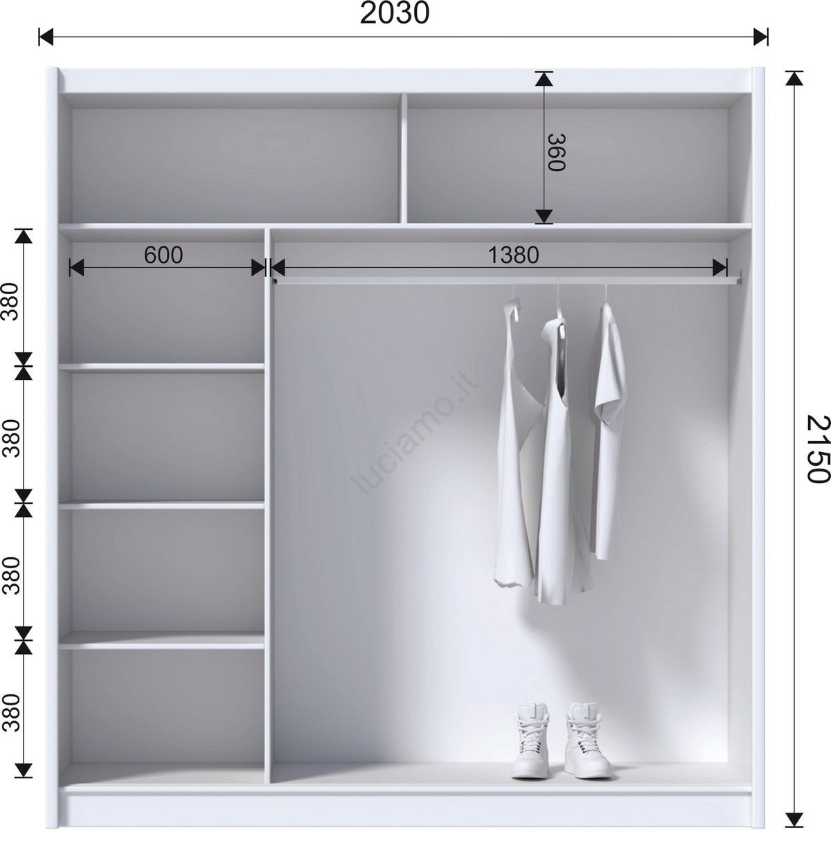 • L'armadio dispone di 4 ripiani aperti, un'asta appendiabiti e 2 ripiani superiori per riporre borse e oggetti stagionali.