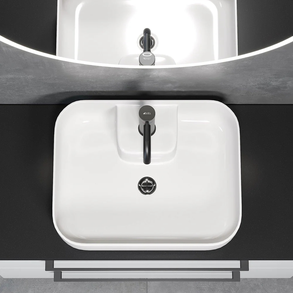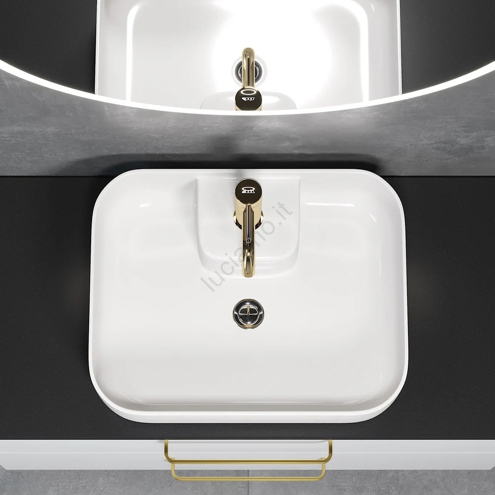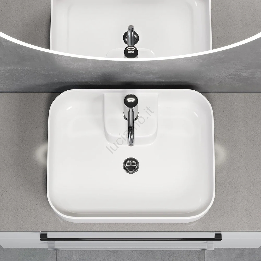 • Il lavabo è progettato per l'installazione su piano, offrendo flessibilità di posizionamento e la possibilità di abbinarlo a diversi tipi di piani per il bagno.