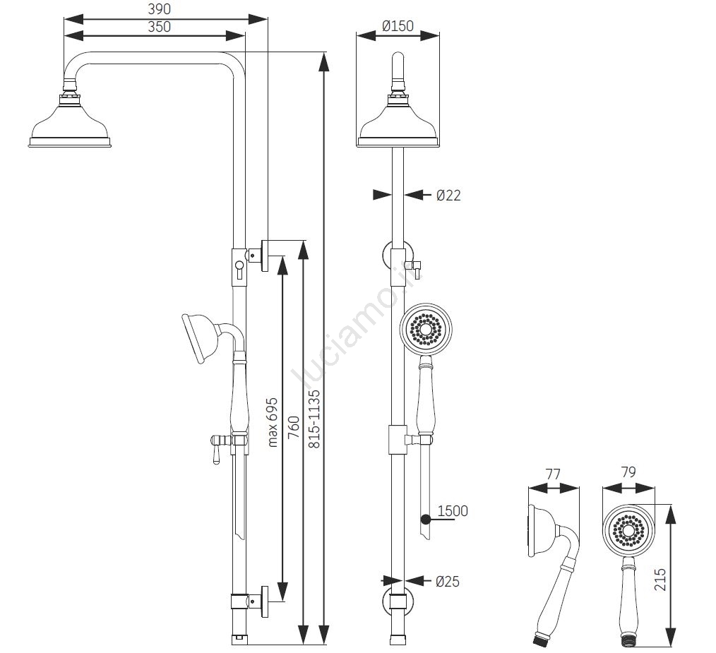 • Asta doccia e soffione superiore in acciaio inossidabile con finitura PVD.