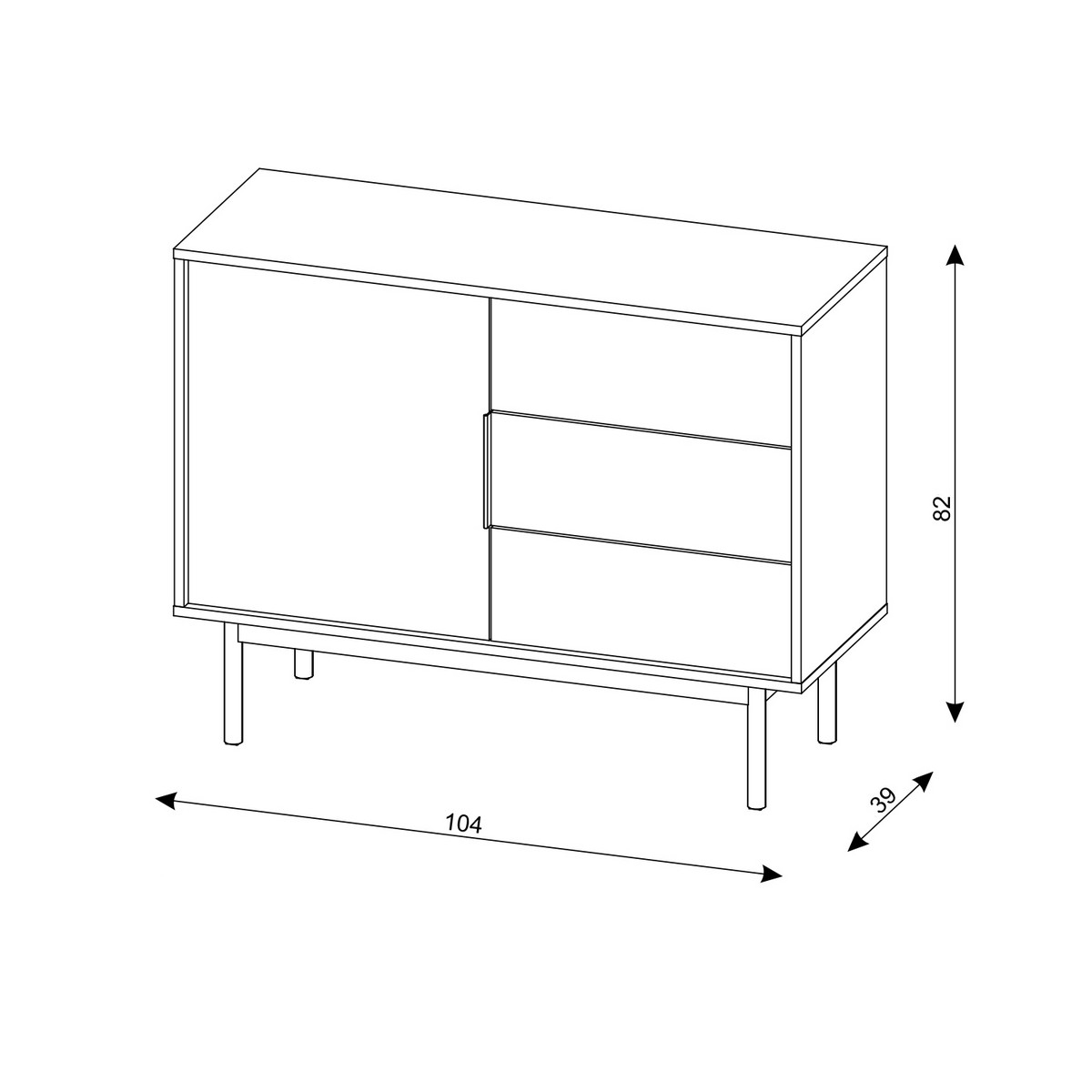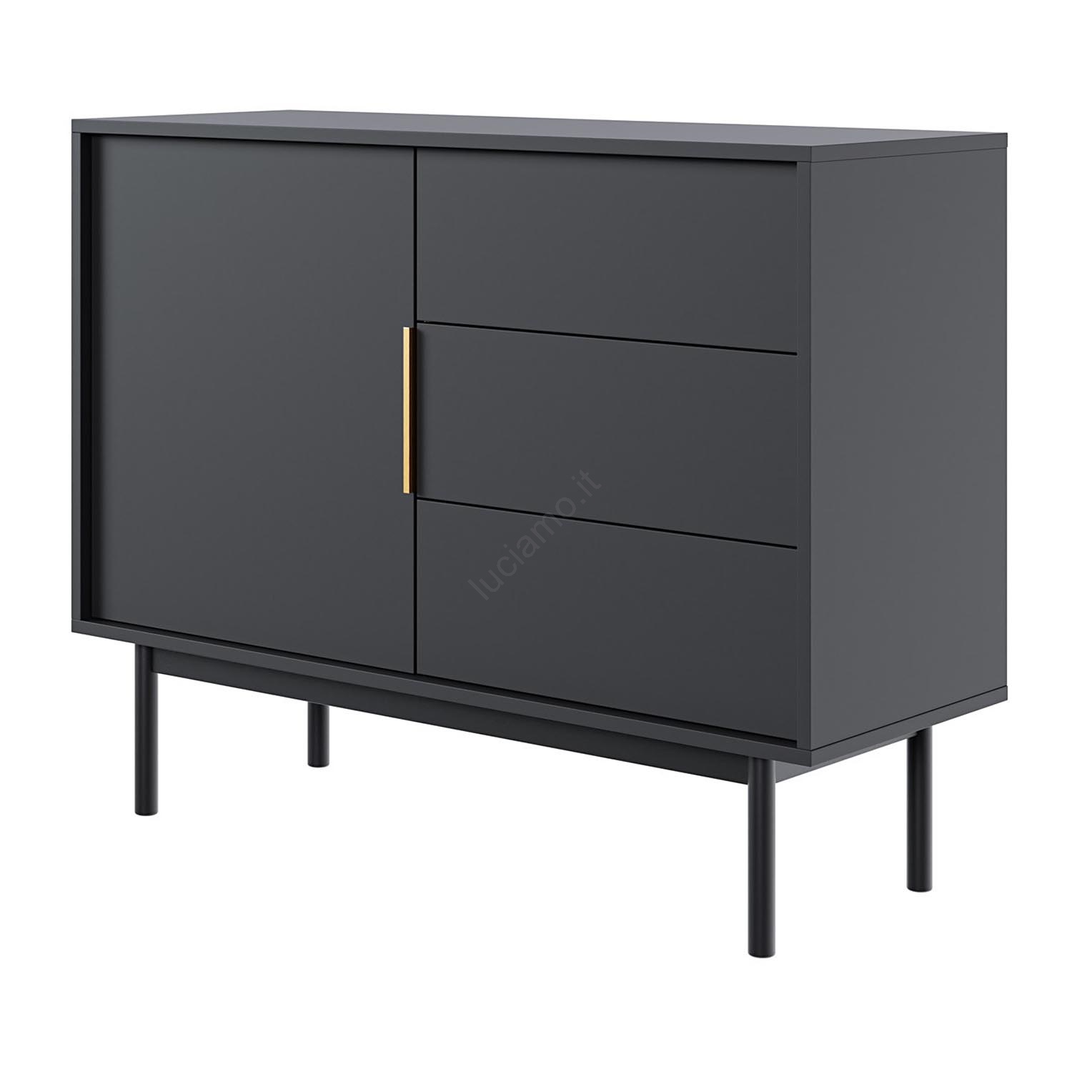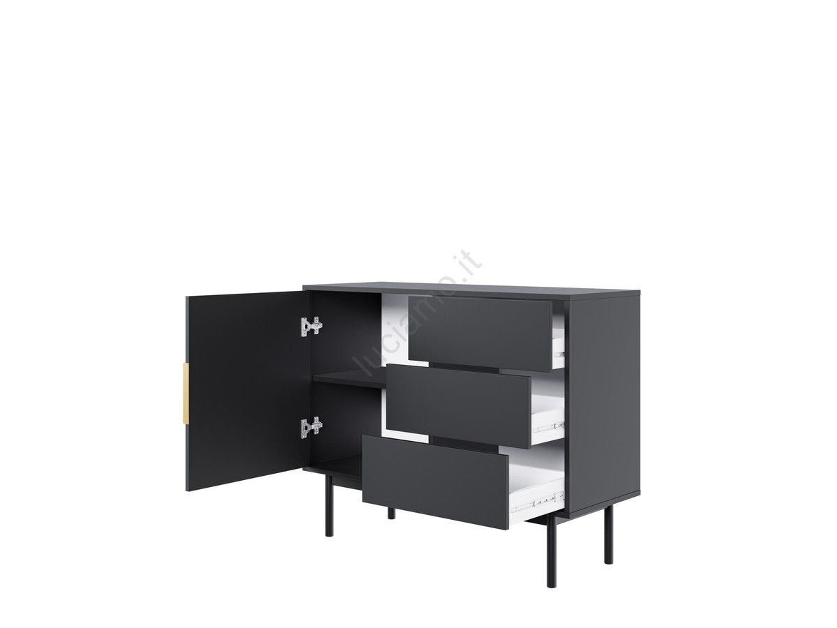 • Presenta un'anta sul lato sinistro e tre cassetti sul lato destro, per riporre gli oggetti in modo ordinato.