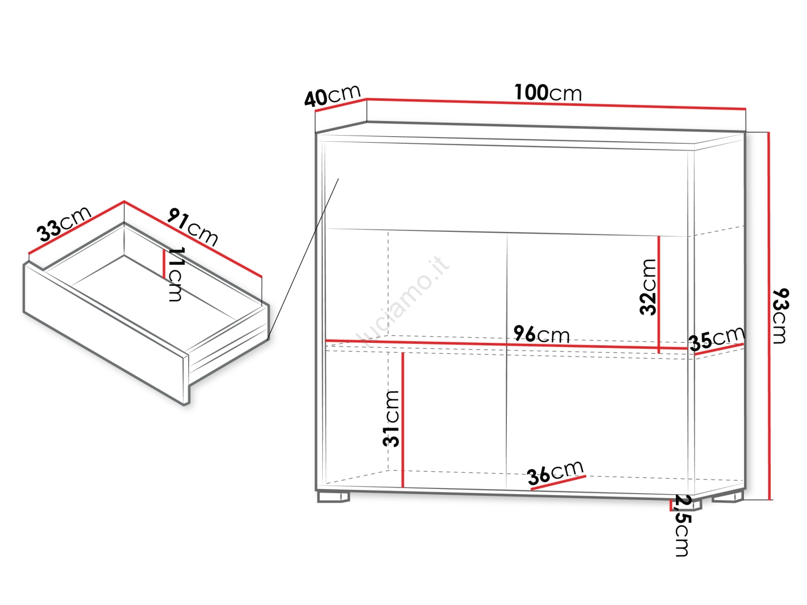 • La combinazione di un capiente cassetto e di un mobile a due ante con ripiani offre uno spazio contenitivo ideale per tenere in ordine i tuoi capi, documenti e altri oggetti indispensabili.