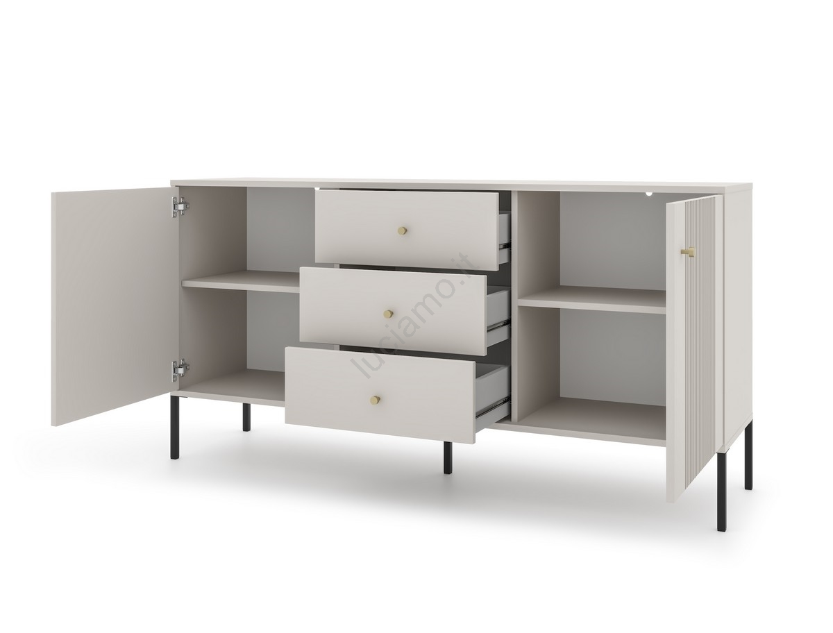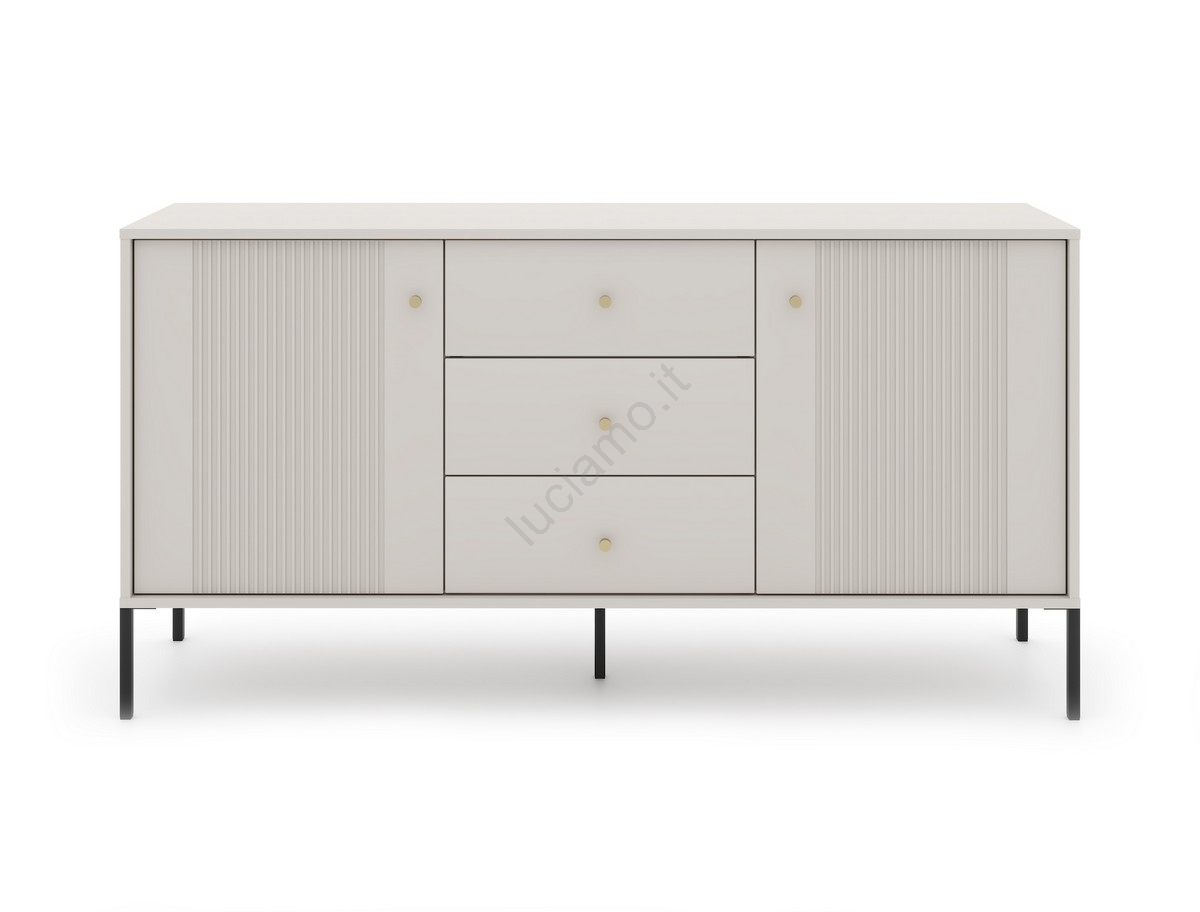 • Presenta tre cassetti centrali e due vani con ante caratterizzate da rigature verticali.