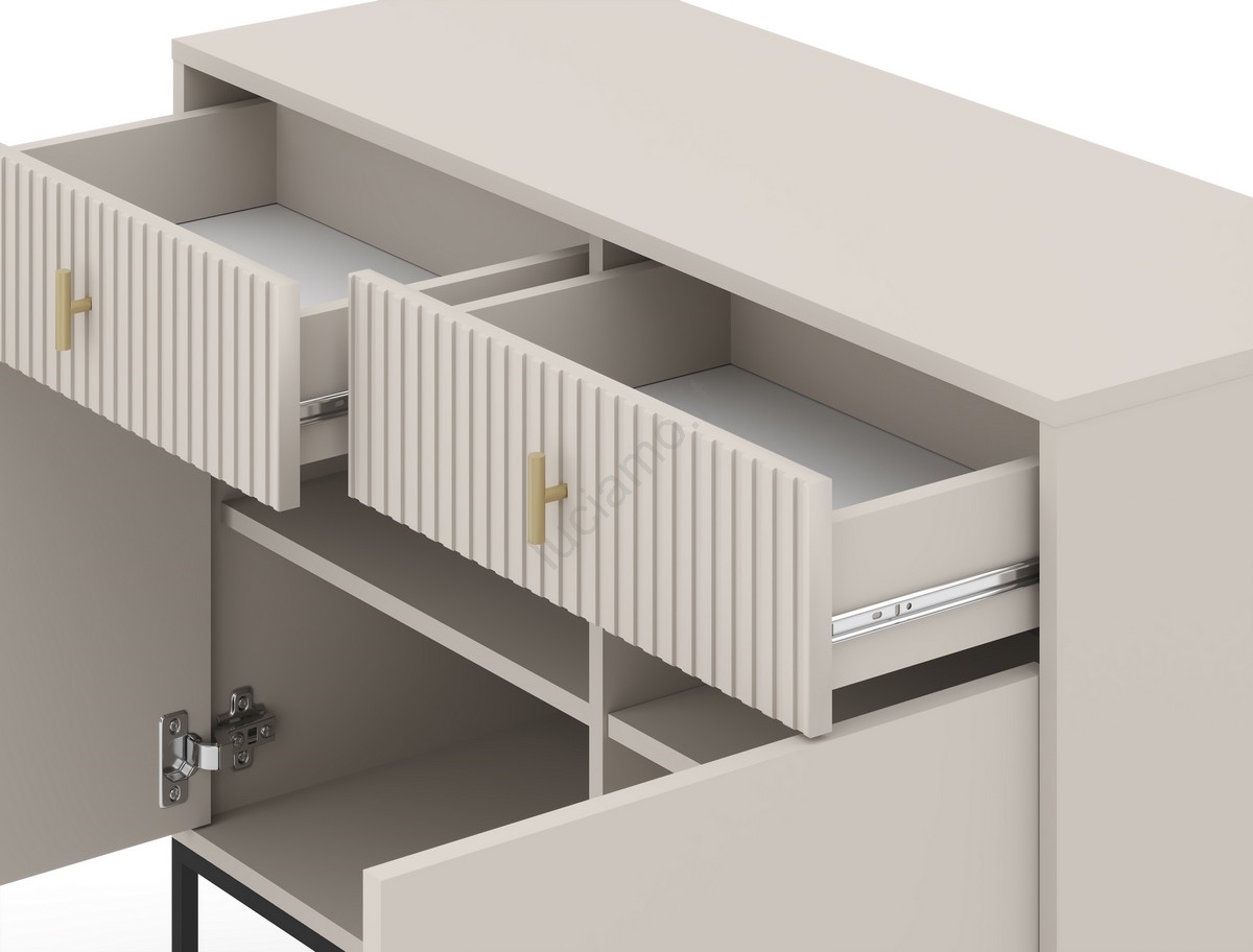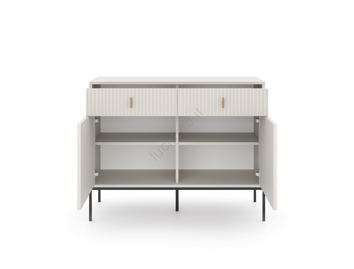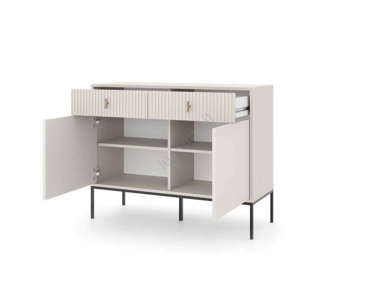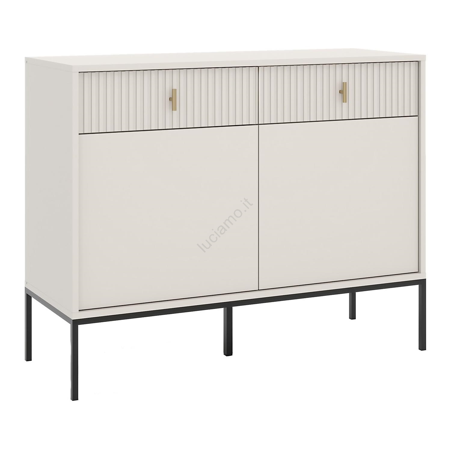 • Dispone di due ante inferiori con ampio spazio contenitivo e di due cassetti dotati di maniglie e di nervature verticali.