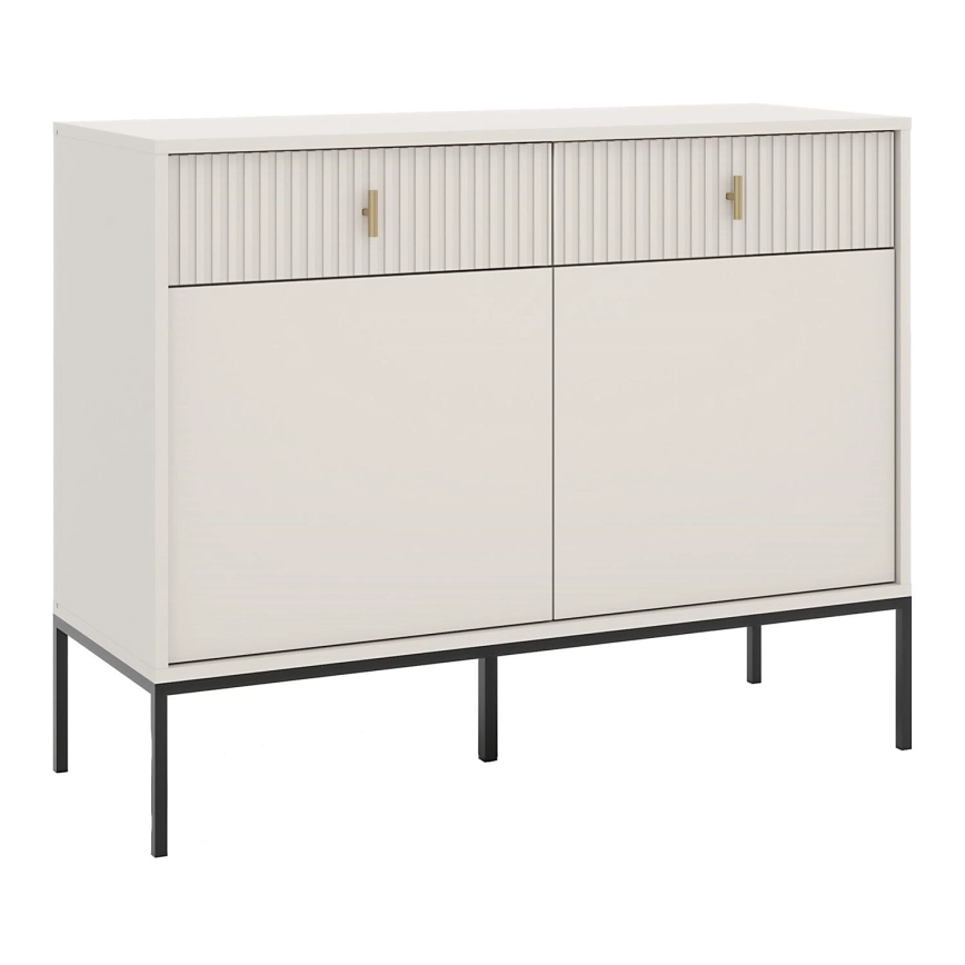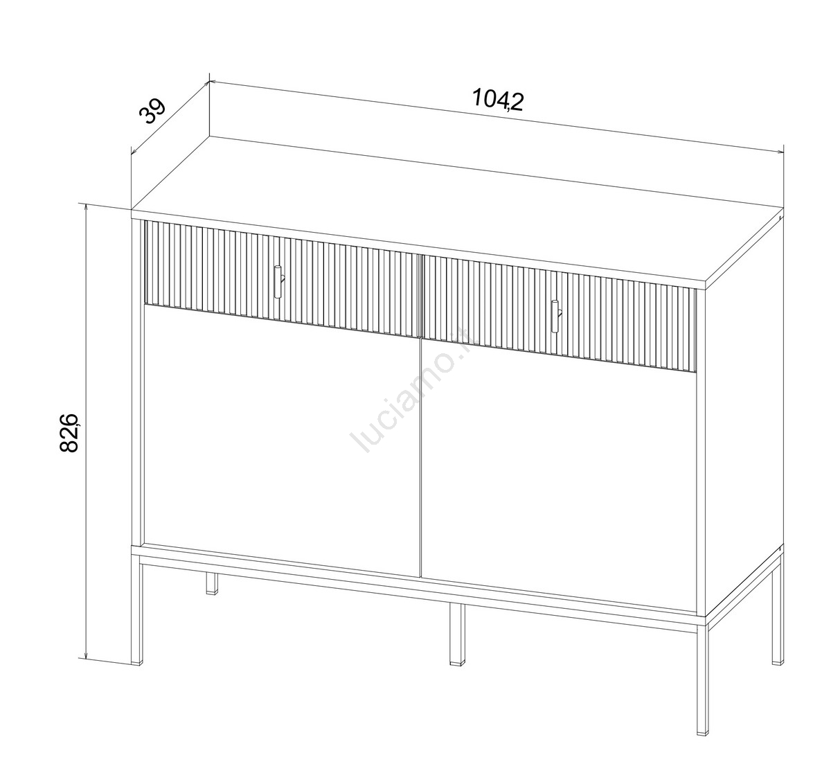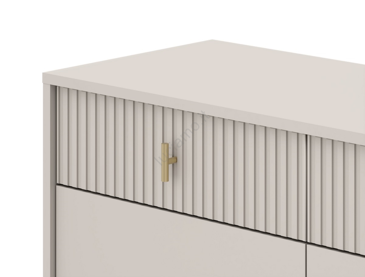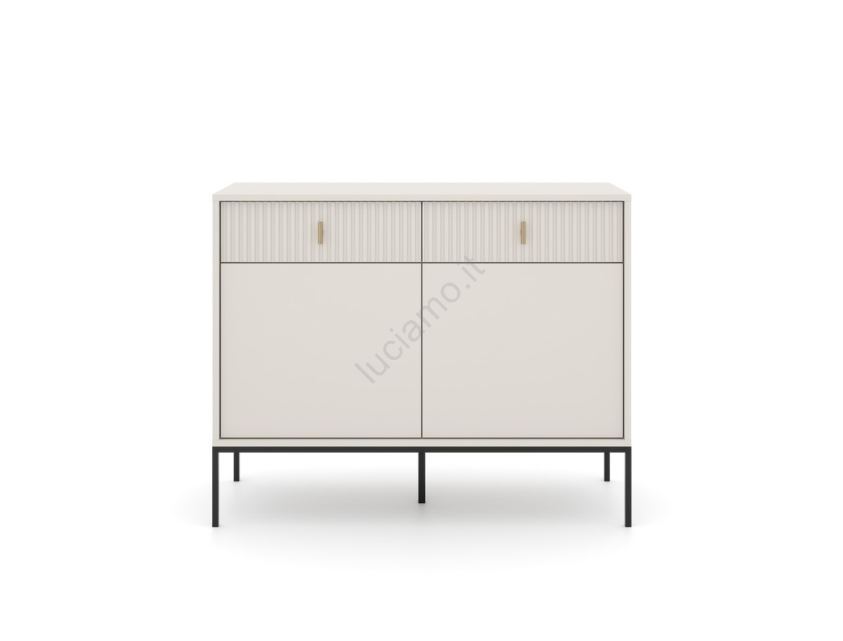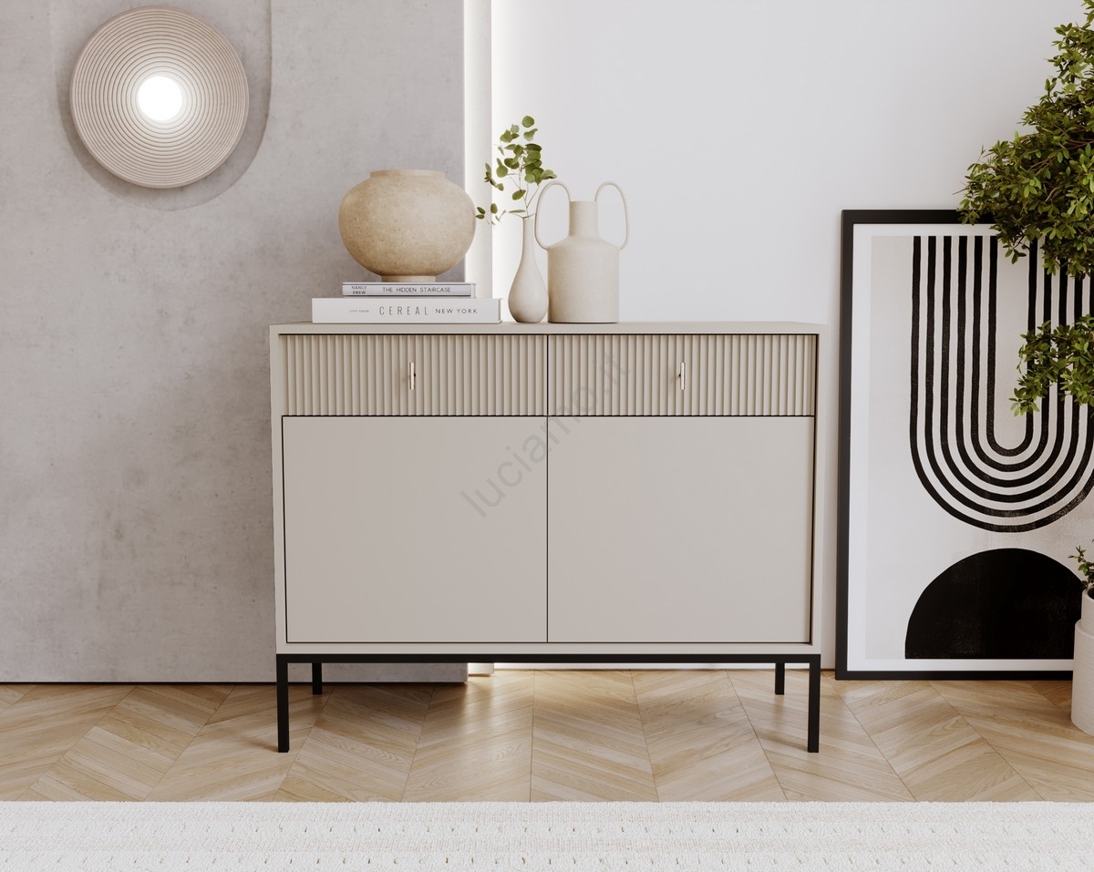 • Dispone di due ante inferiori con ampio spazio contenitivo e di due cassetti dotati di maniglie e di nervature verticali.