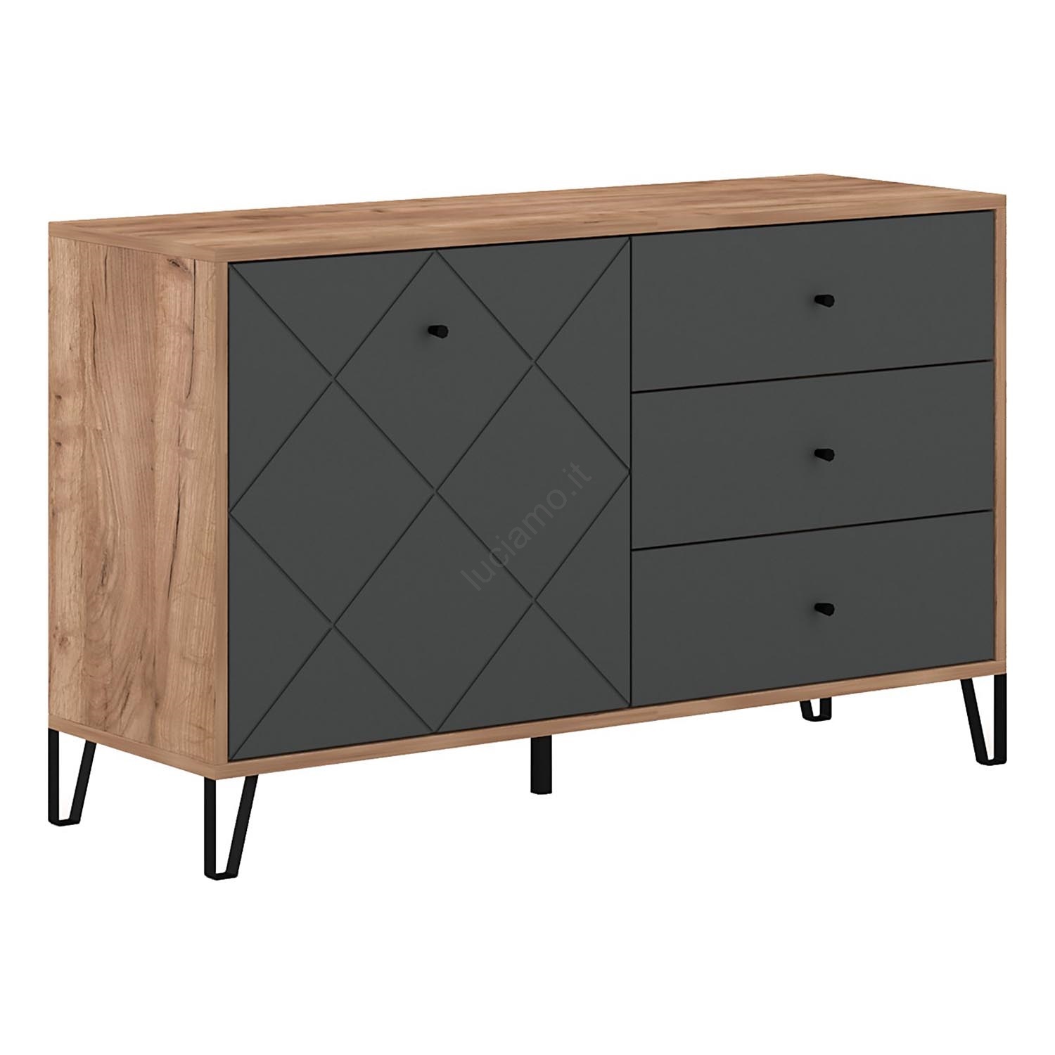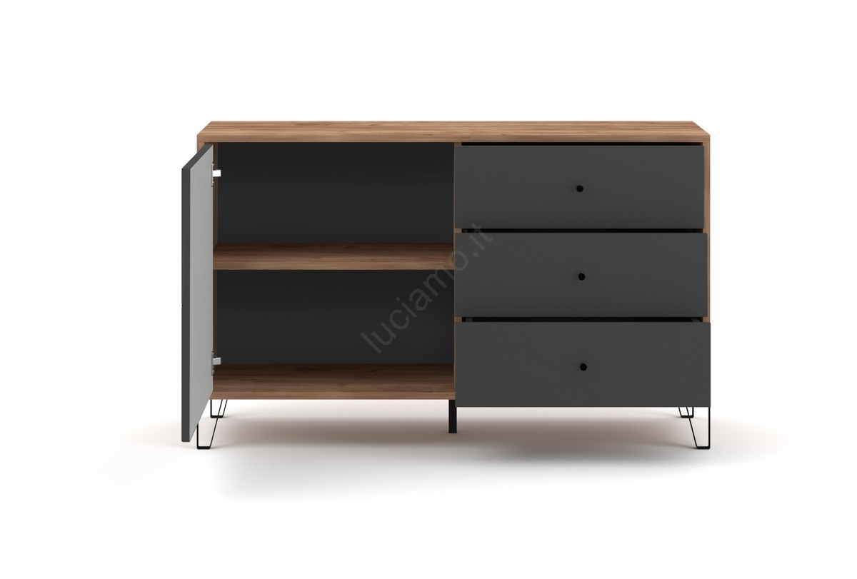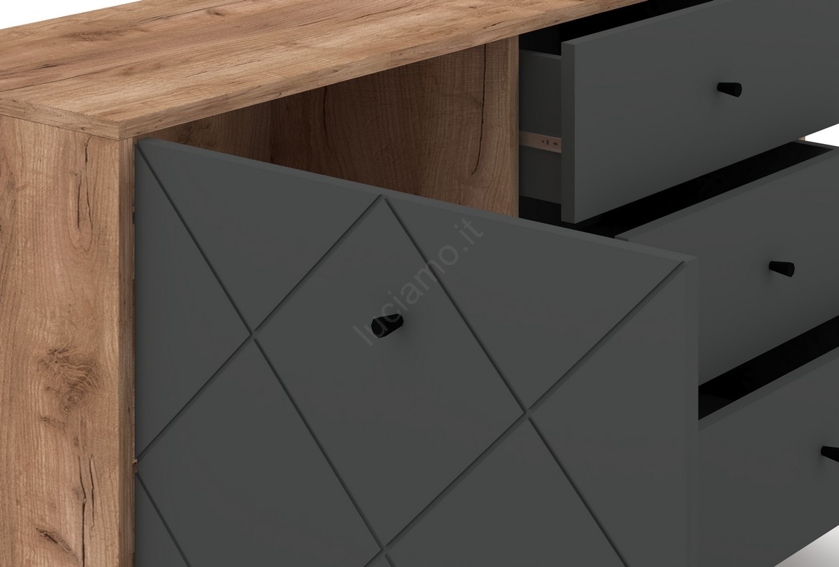 • Presenta un'anta sul lato sinistro e tre cassetti sul lato destro, per un'organizzazione semplice e ordinata degli oggetti.