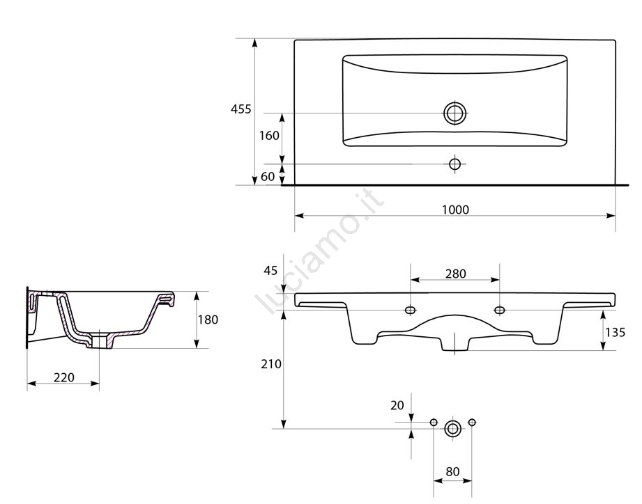 • Lavabo moderno ed elegante con troppopieno e foro per miscelatore.