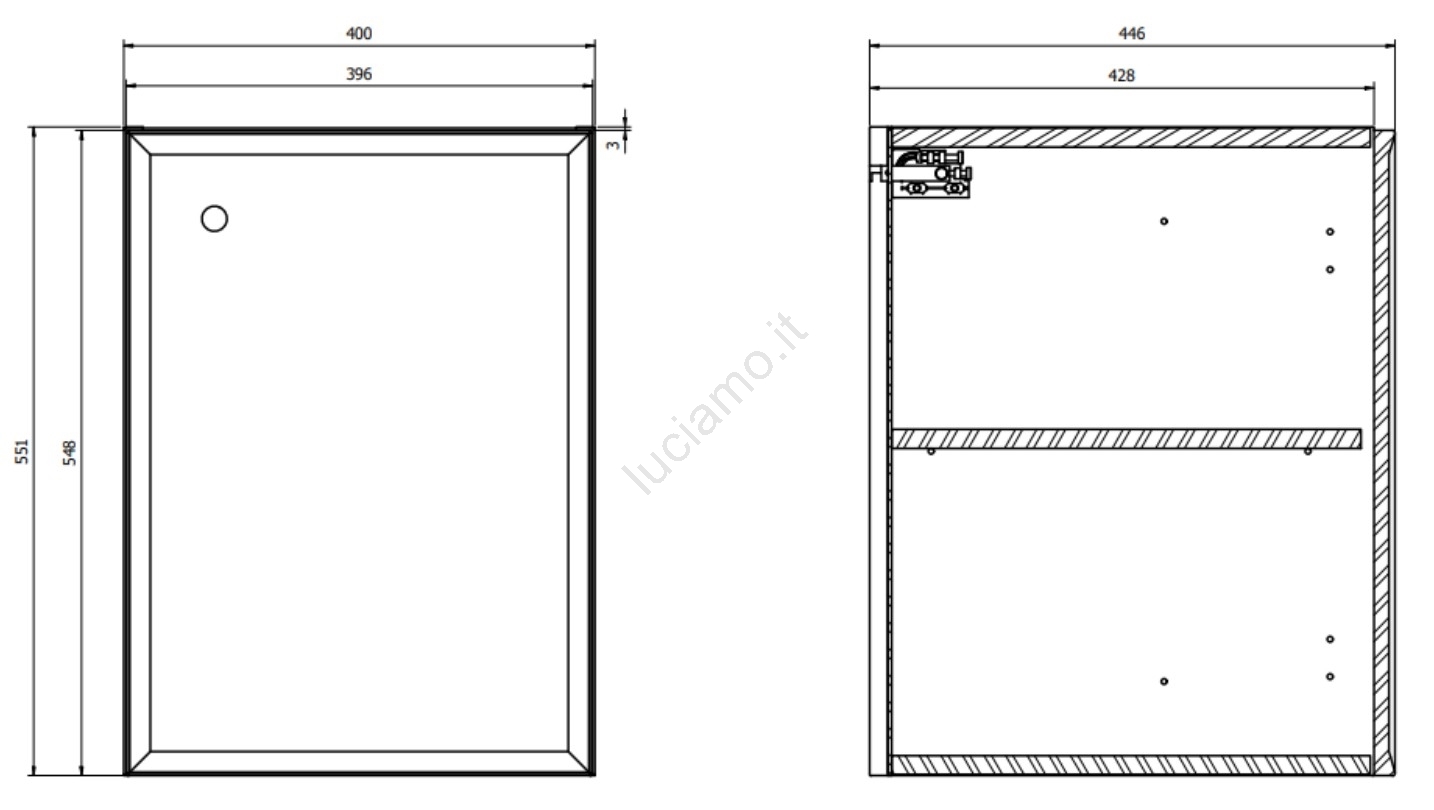 • Il frontale, il corpo e la mensola interna sono realizzati in truciolare da 16 mm laccato bianco opaco.