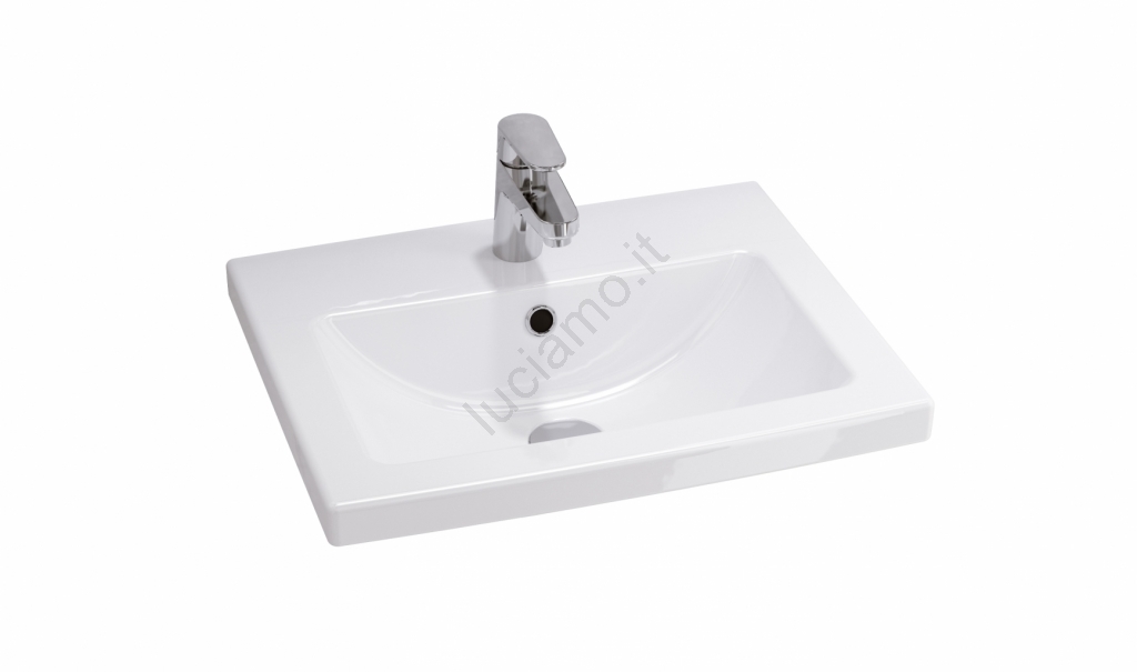 • Il lavabo in ceramica ha una forma rettangolare classica con foro per rubinetto e troppopieno.