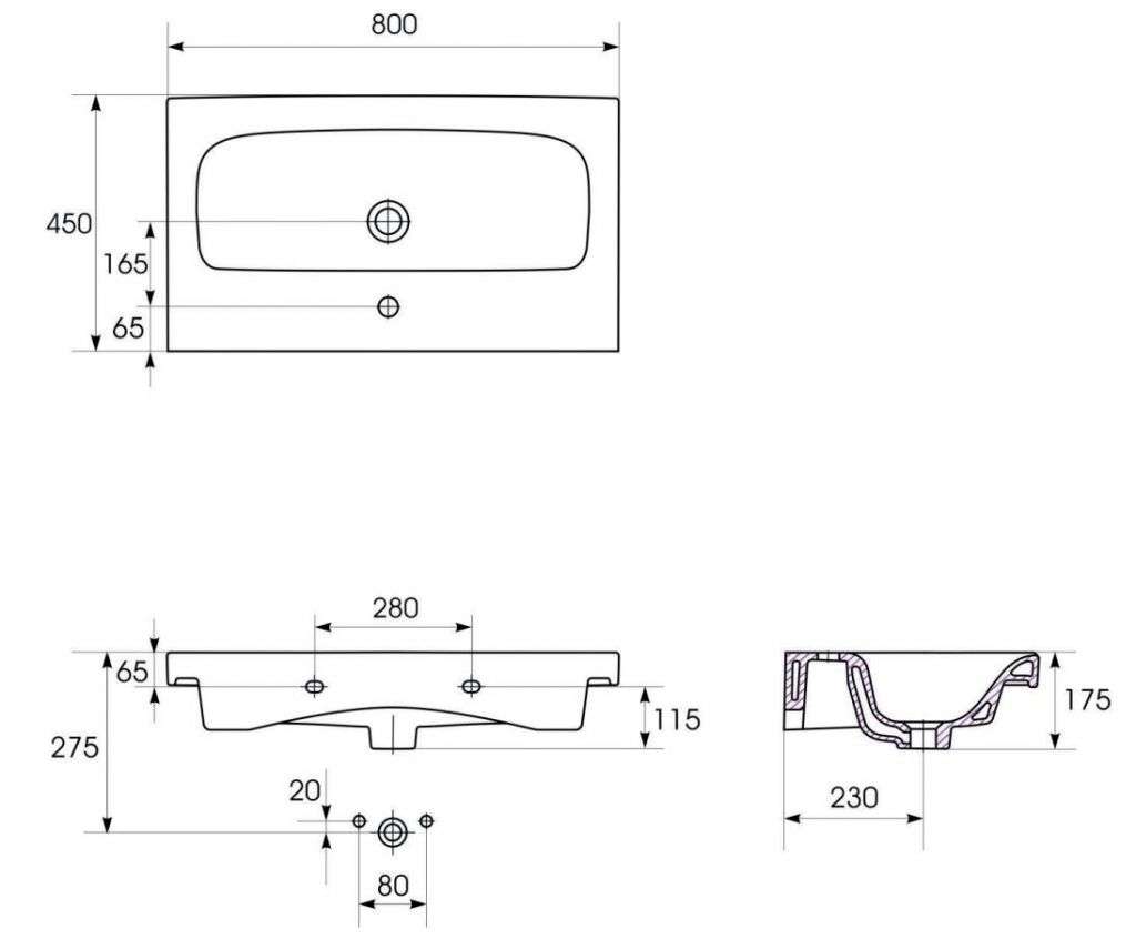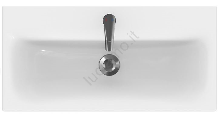 • Il lavabo in ceramica presenta una forma rettangolare classica con foro per rubinetto e troppopieno.