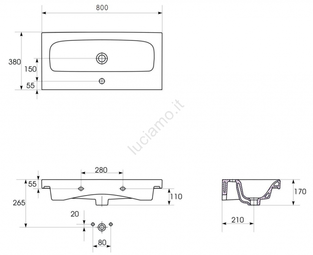 • Il lavabo in ceramica presenta una forma rettangolare classica con foro per rubinetto e troppopieno.