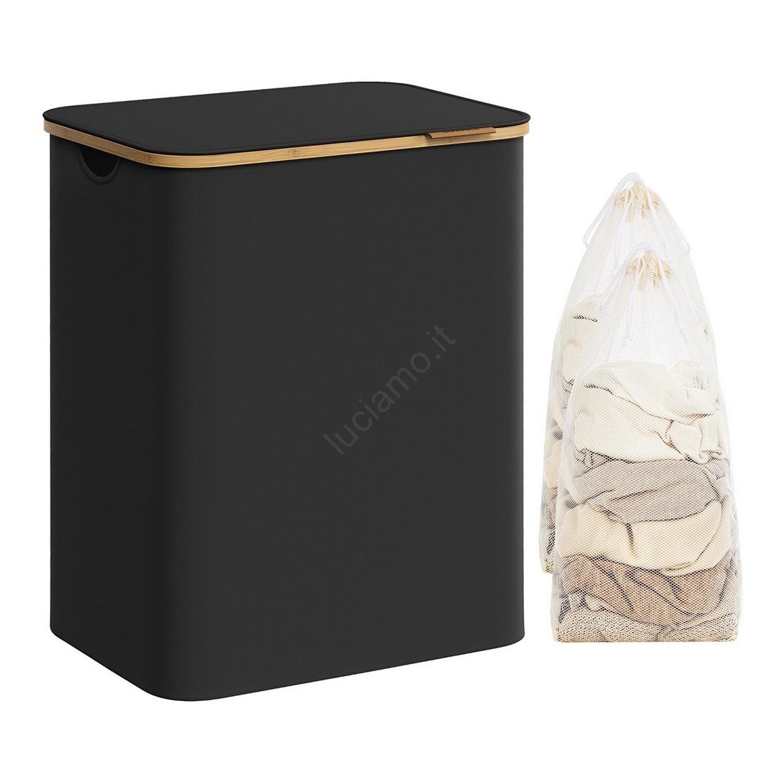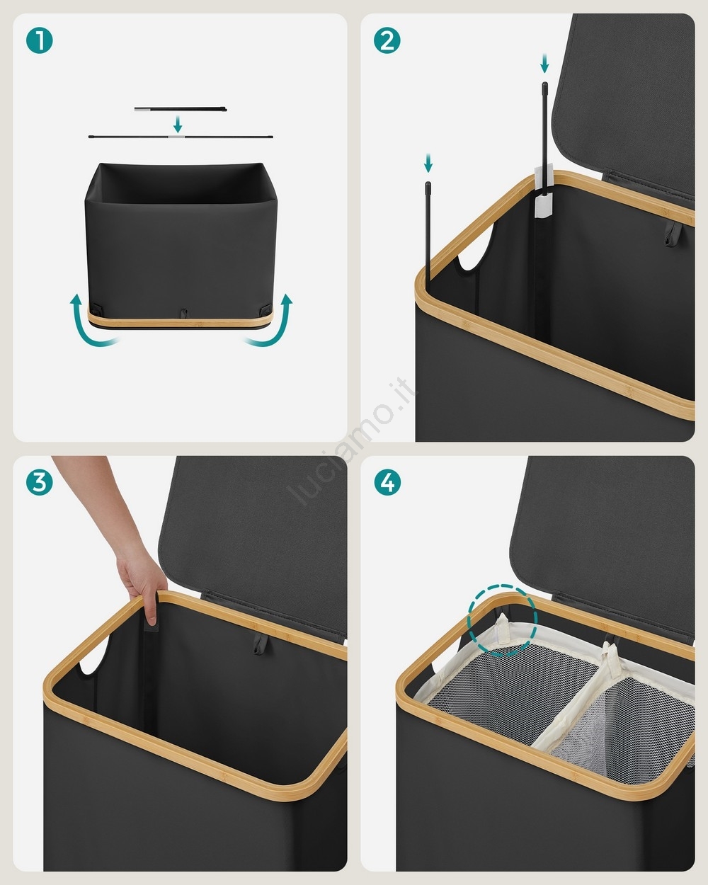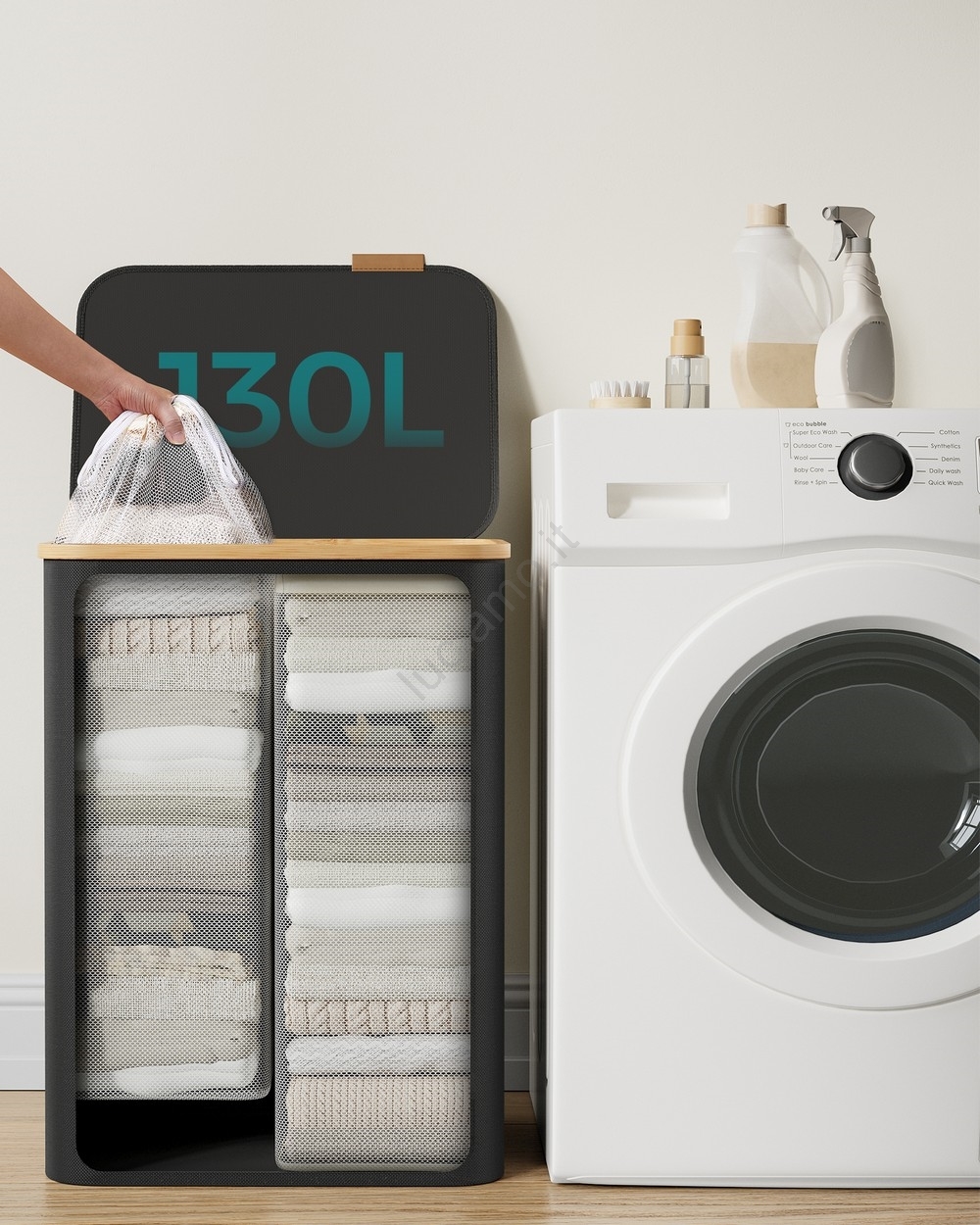 • Il cesto ha una grande capacità 130 l per i vostri capi, asciugamani e biancheria da letto e 2 scomparti che vi permettono di separare tutto per colore.