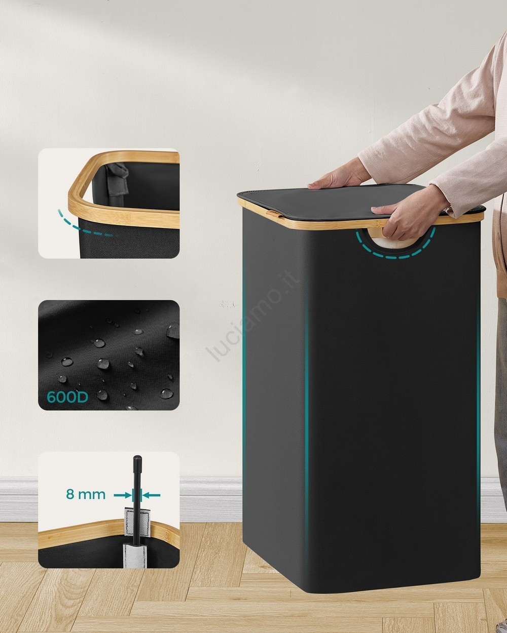 • Il coperchio si apre e si chiude con una sola mano, così da coprire facilmente il bucato - il coperchio impedisce la diffusione degli odori e protegge i capi dalla polvere.