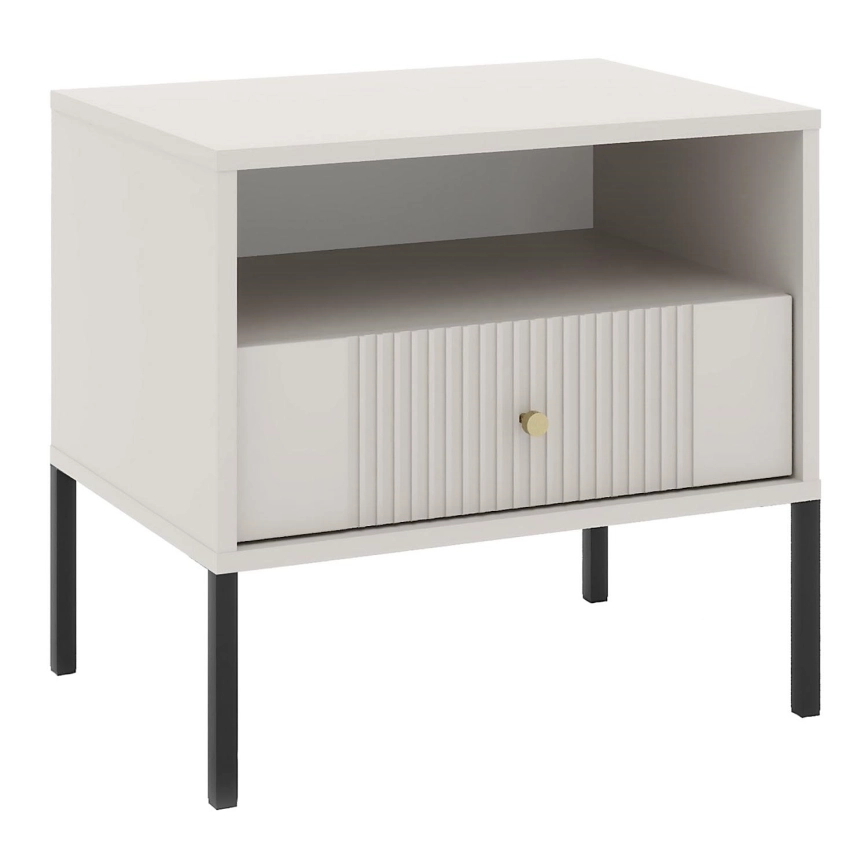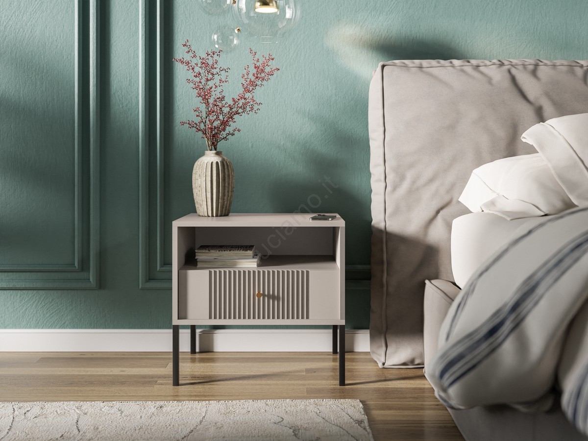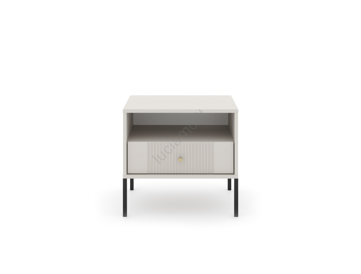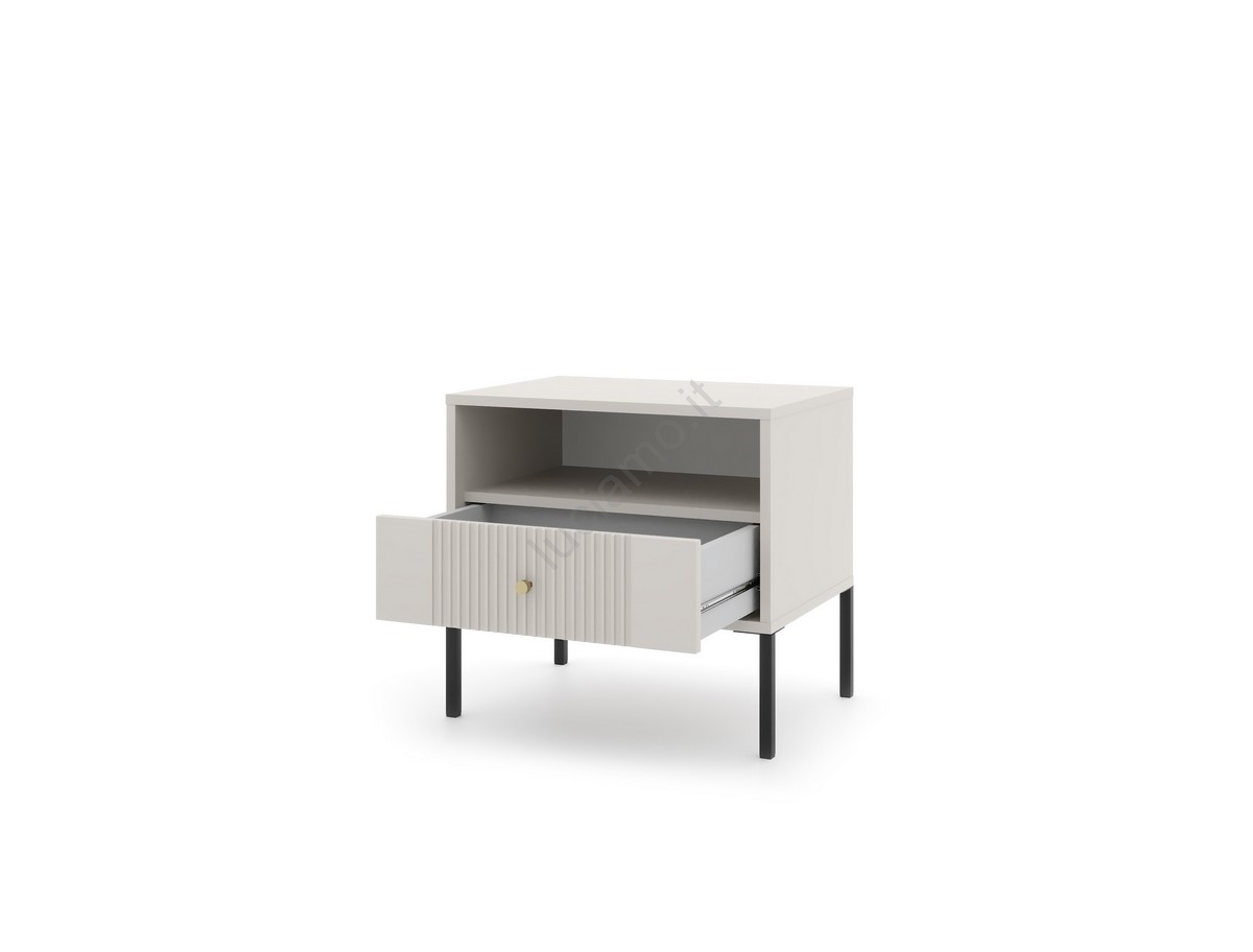 • Ha un ripiano aperto e un cassetto decorato con scanalature verticali per un effetto visivo raffinato.