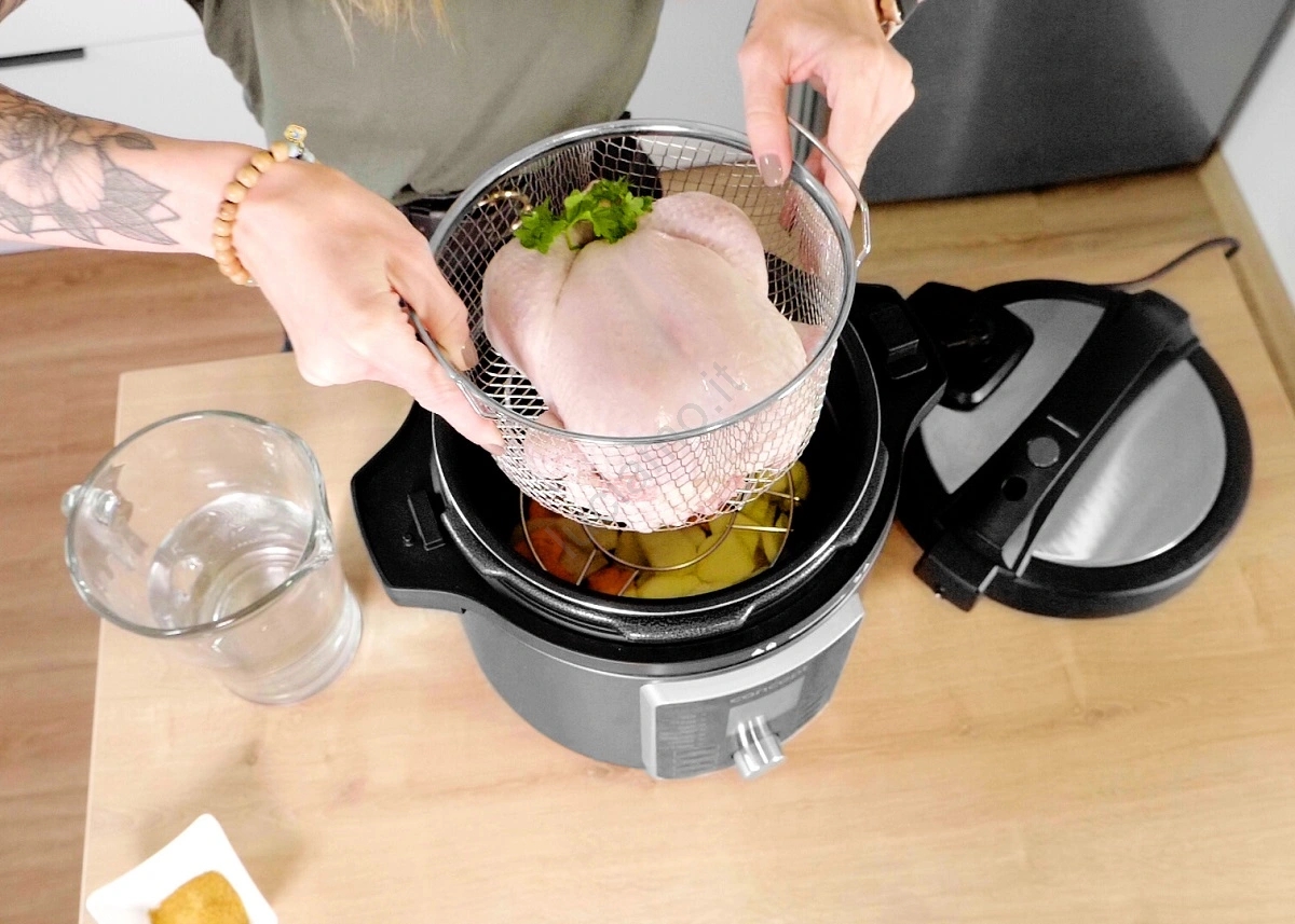 • 11 in 1: cuocivapore, friggitrice ad aria, pentola a pressione, pentola per cottura lenta, cuociriso, preparatore di zuppe, forno, essiccatore, yogurtiera, padella, cottura.