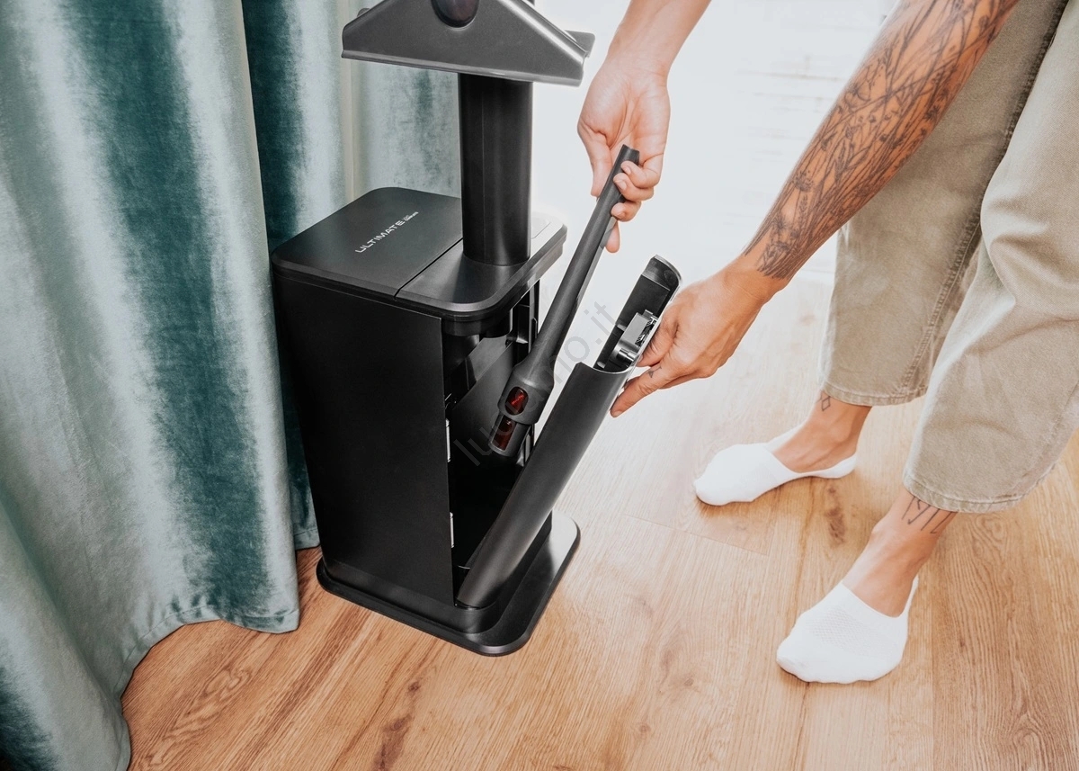 • Ricaricate completamente l'aspirapolvere in 3,5 ore, e in due modi – o lo inserite nella stazione di ricarica, oppure collegate il adattatore direttamente alla porta della batteria.