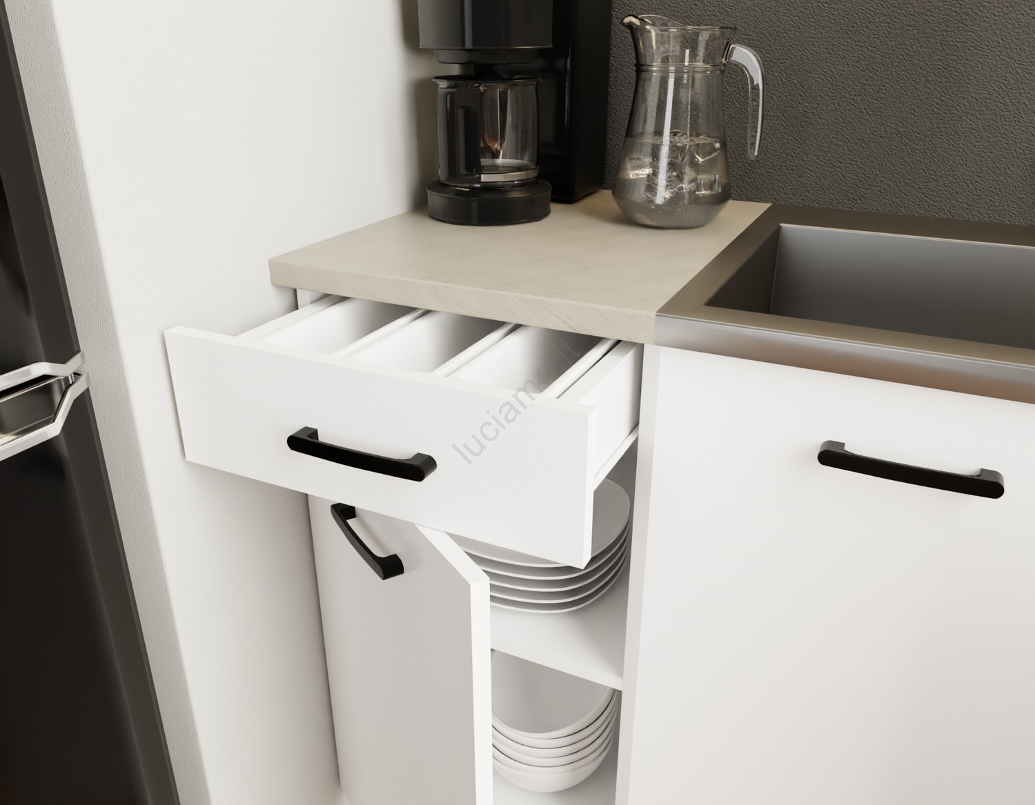 • Il pratico mobile cucina offre ampio spazio di stoccaggio ben organizzato.