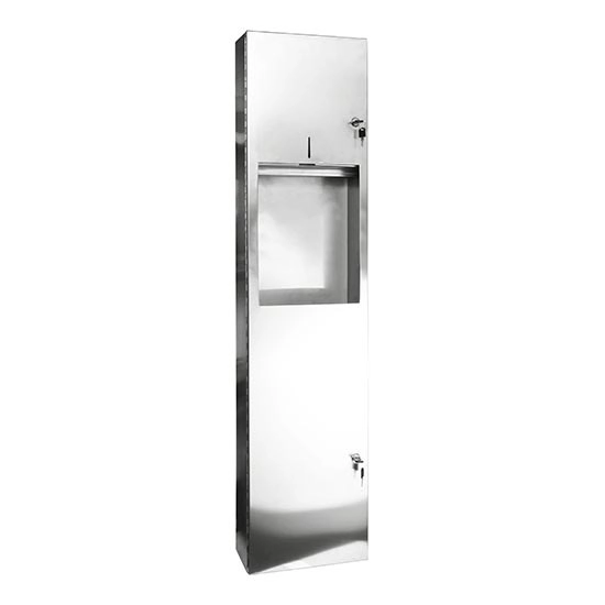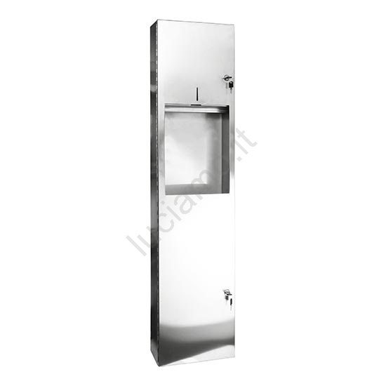 • Distributore combinato per asciugamani di carta con cestino integrato per il massimo risparmio di spazio.