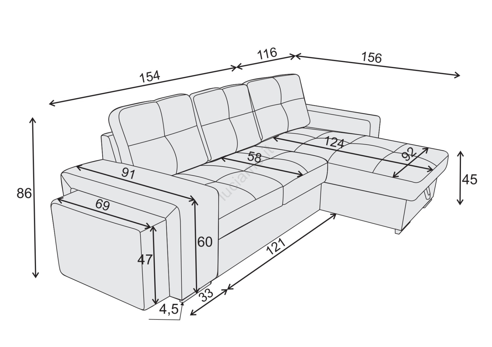 • Nel bracciolo è inoltre nascosto un pouf nascosto, che è parte del divano e, se necessario, fornisce un posto a sedere aggiuntivo o un poggiapiedi.