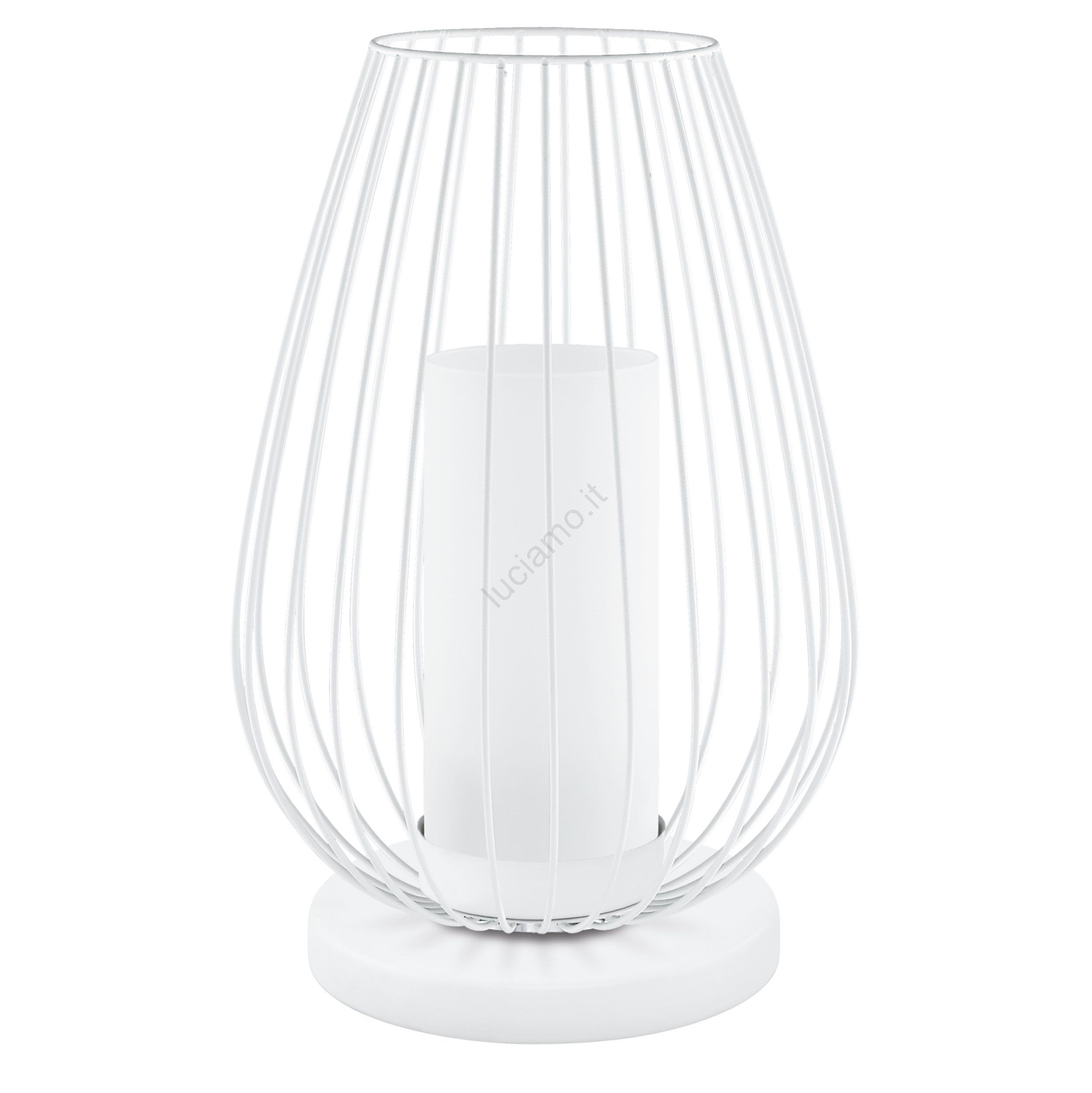 • Lampada da tavolo moderna con paralume esterno decorativo in rete metallica; il diffusore interno è in vetro bianco.