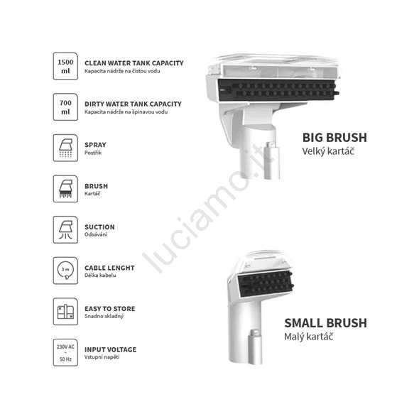 • La capacità del serbatoio per l'acqua pulita è di 1500 ml, mentre quello per l'acqua sporca è di 700 ml.