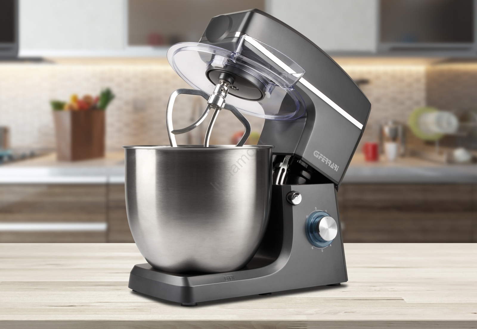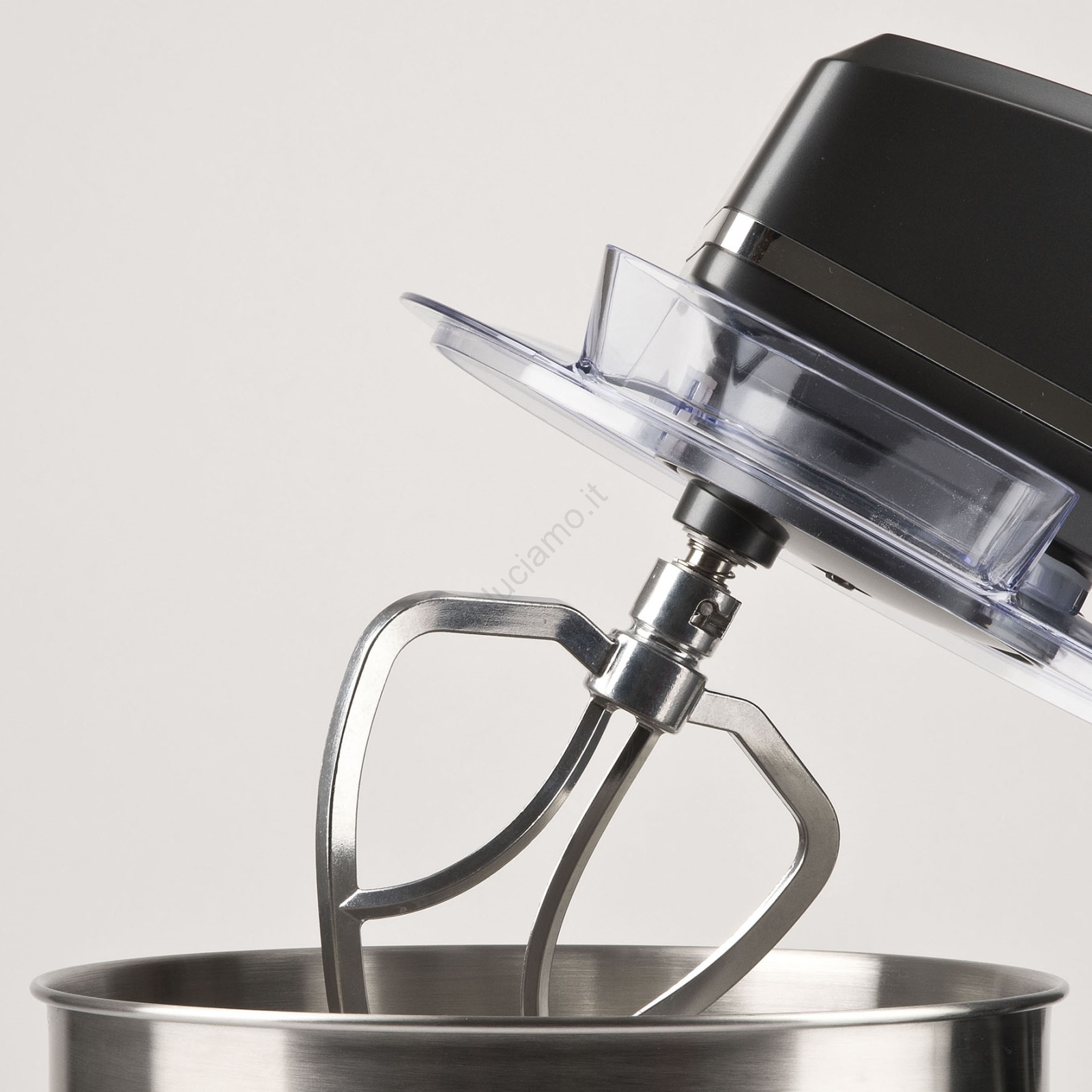 • Set completo di accessori: gancio impastatore, frusta a foglia, frusta a fili e coperchio trasparente per la ciotola.