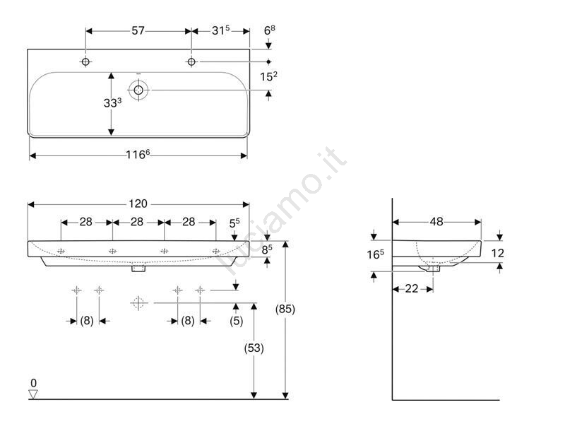 • Doppio lavabo con troppopieno e fori per rubinetteria.