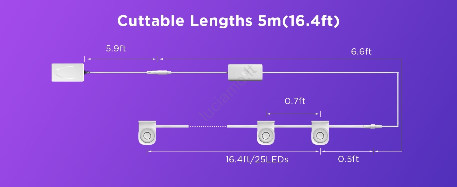 • Una catena di 25 luci LED programmabili indipendentemente, distribuite su una lunghezza di 5 metri, trasforma una parete noiosa in un'opera d'arte con una proiezione RGB su larga scala.
