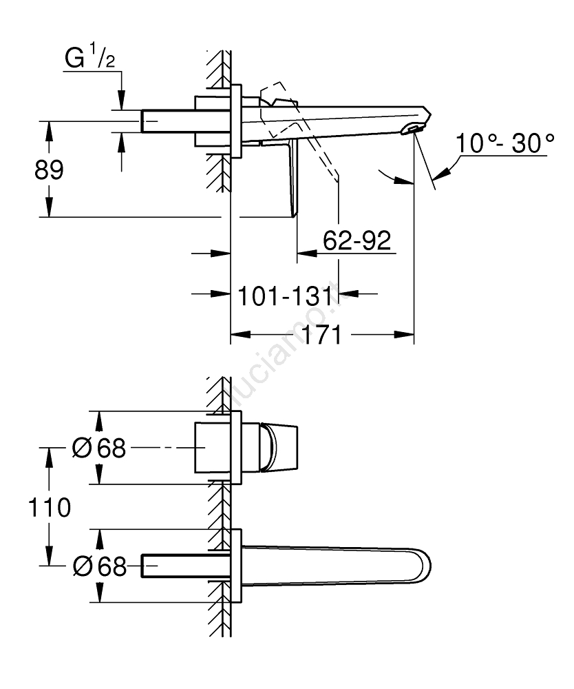 • La distanza tra il centro della maniglia e l'uscita è di 110 mm, lunghezza del beccuccio 170 mm.