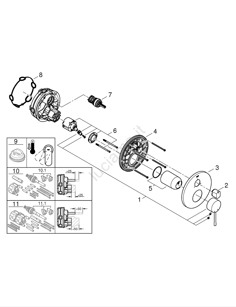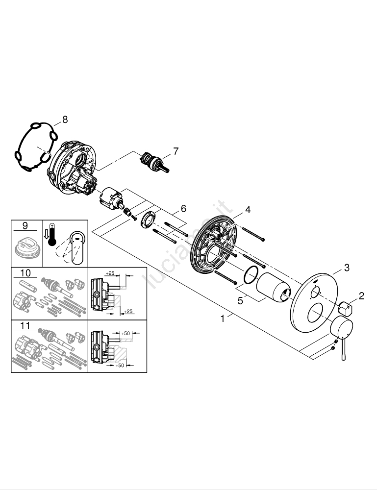 • Sistema GROHE QuickFix con guarnizione coperta ed elementi di fissaggio per un'installazione rapida e semplice.