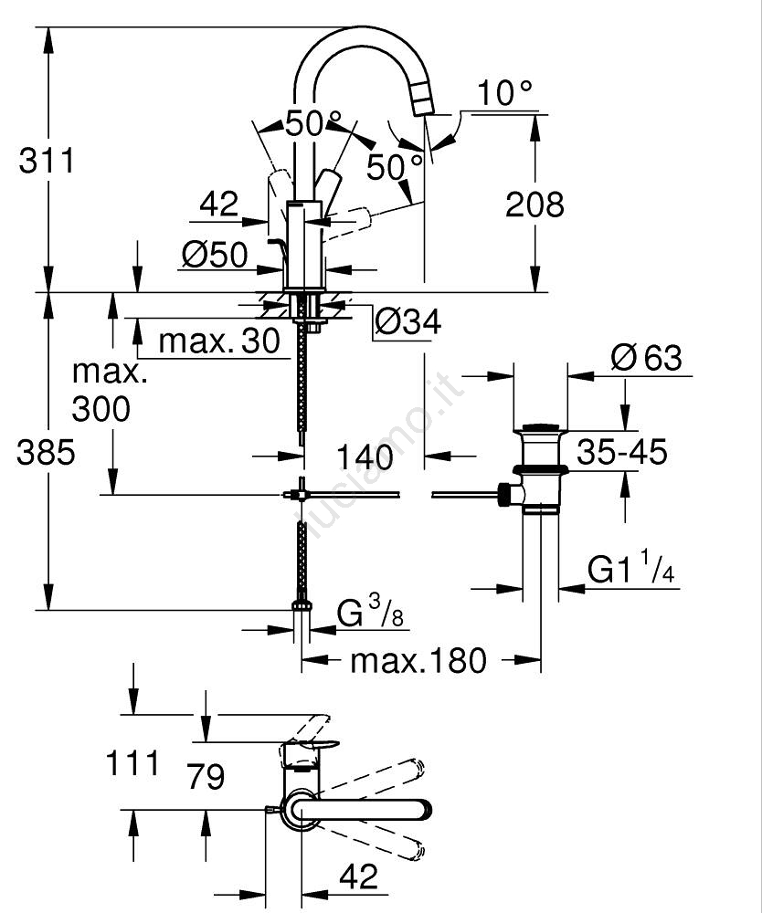 • Altezza del miscelatore: 311 mm, ideale per l'installazione sotto la finestra.