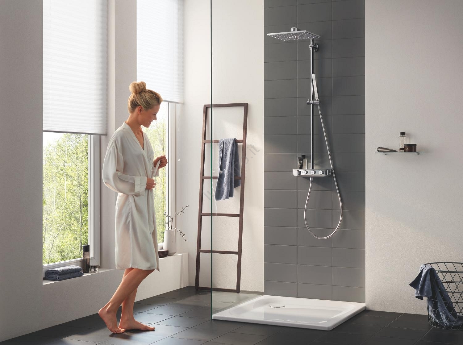 • Il ripiano portaoggetti integrato GROHE EasyReach offre uno spazio pratico per riporre i prodotti da doccia.