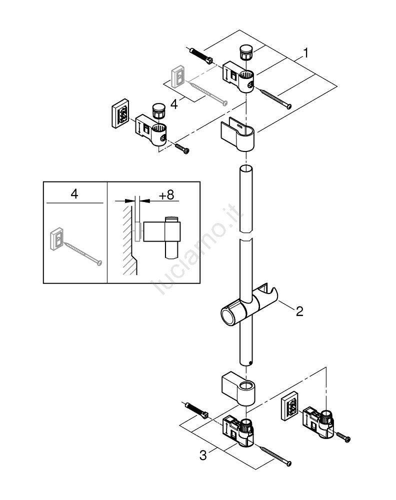 • Installazione con foratura (viti e tasselli inclusi) o tramite incollaggio (adesivo GROHE QuickGlue S 41 247 000 venduto separatamente; sono necessari 2 pezzi).