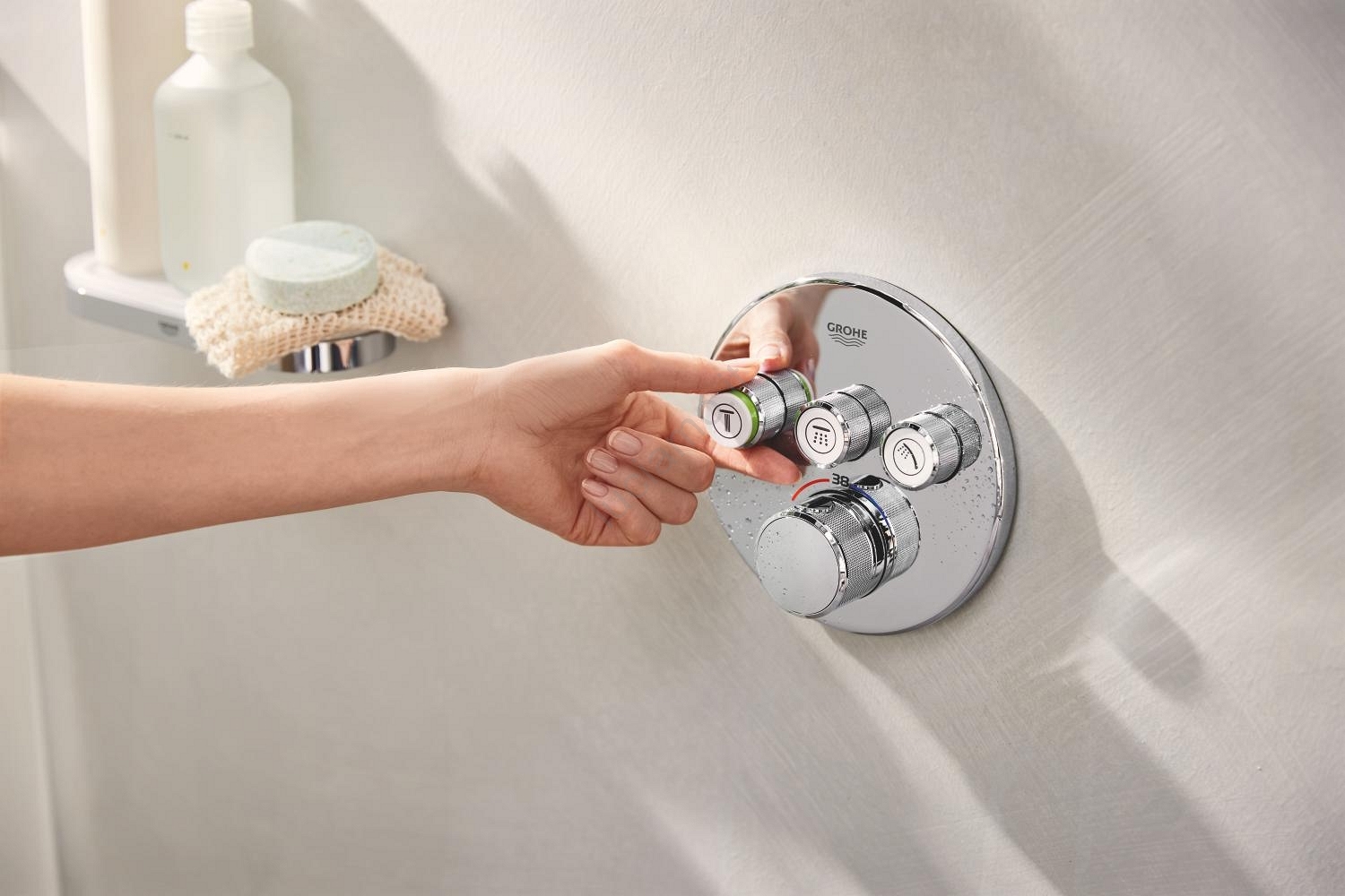 • Comando GROHE SmartControl: premendo si accende/spegne, ruotando si regola la portata dell'acqua dalla modalità risparmio al flusso pieno.
