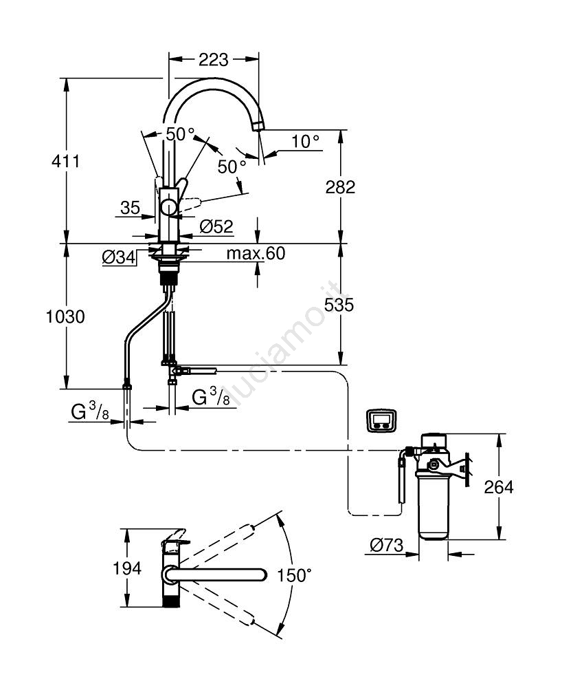 • Leva separata per l'acqua filtrata assicura un utilizzo semplice; i condotti separati evitano la miscelazione tra acqua filtrata e non filtrata.