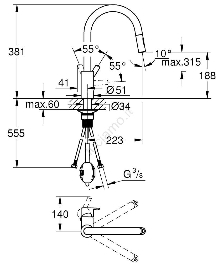 • Doccetta estraibile doppia con selettore per passare dal getto laminare al getto SpeedClean.