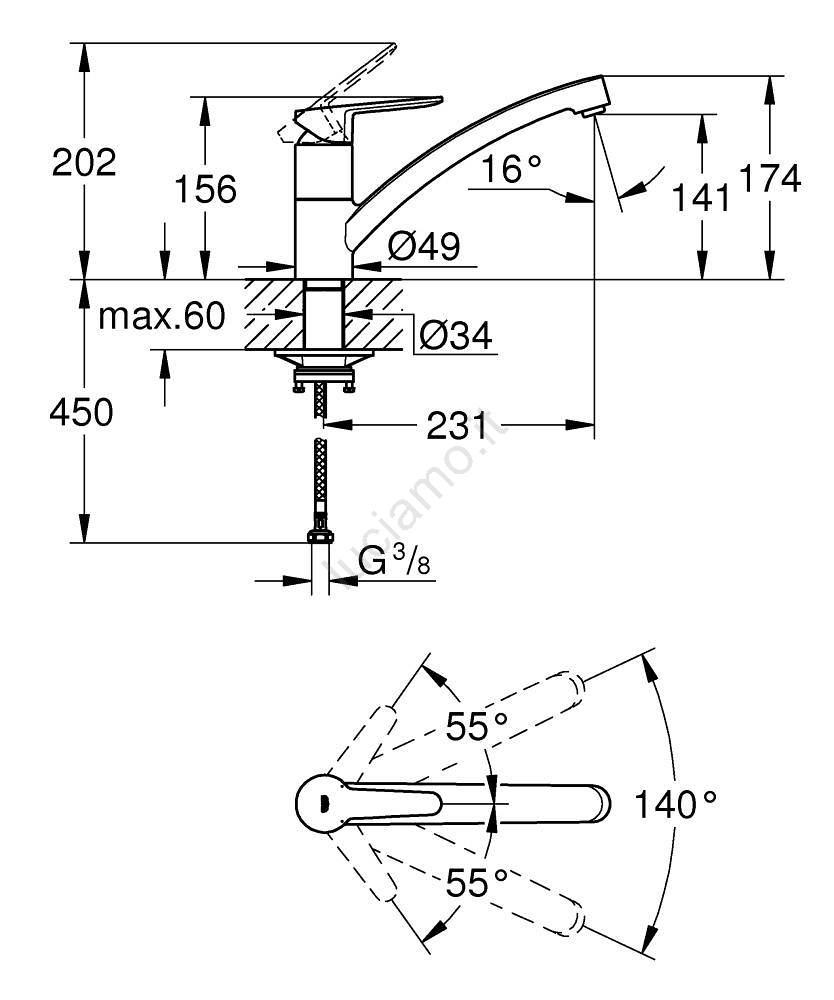 • L'angolo di rotazione della canna di 140° facilita le operazioni durante il lavaggio dei piatti.