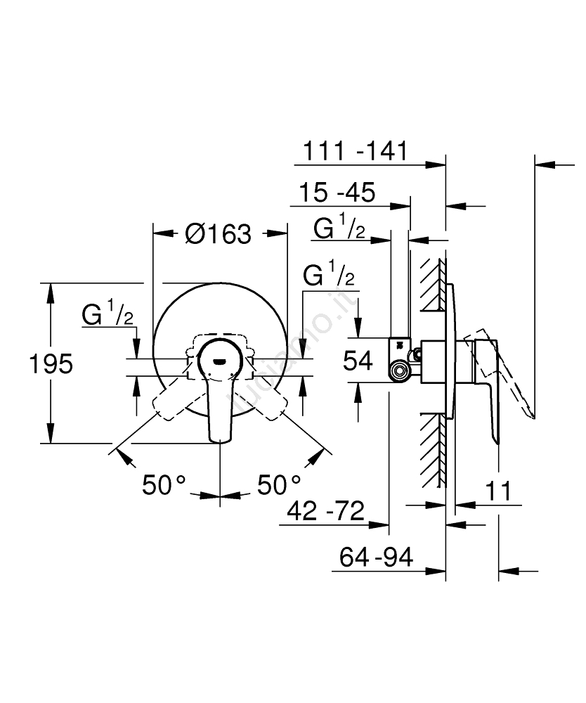 • Miscelatore doccia ad incasso a leva con corpo per montaggio a parete.