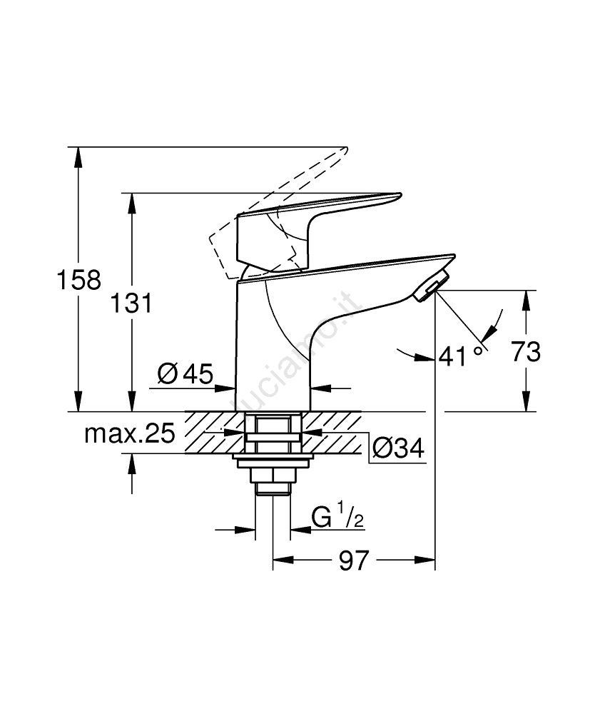 • Altezza miscelatore: 131 mm, lunghezza beccuccio: 97 mm, zona di comfort: 73 mm.