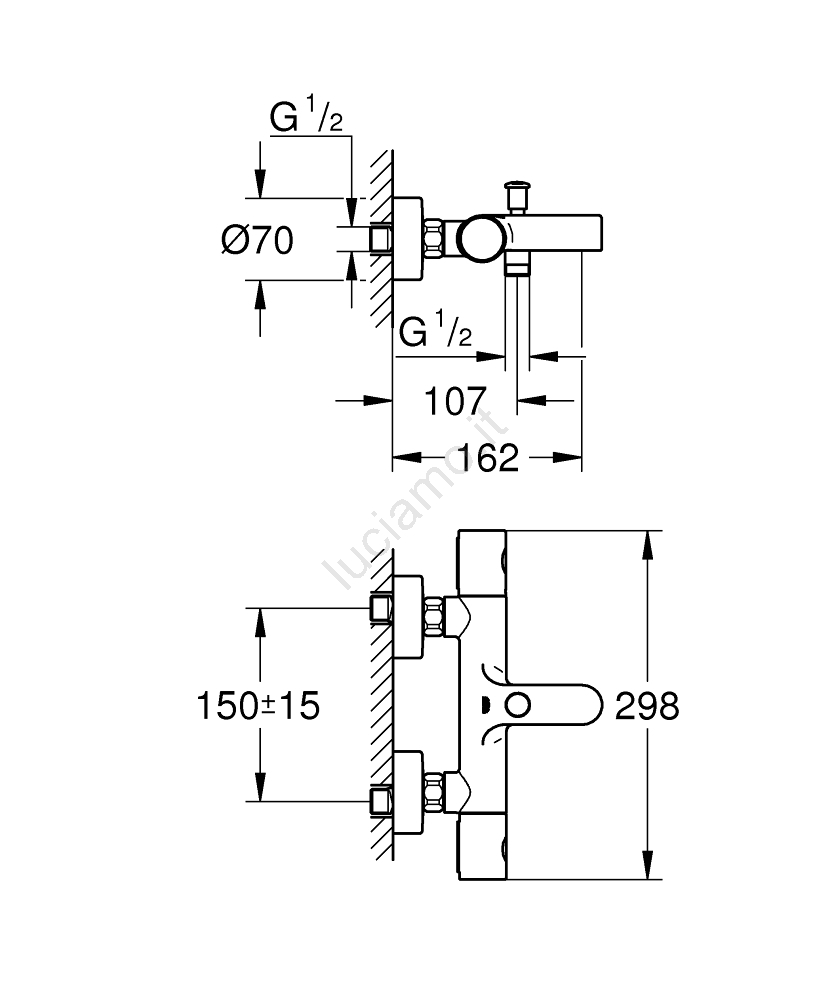 • Miscelatore termostatico per vasca da parete, ideale per bagni moderni.