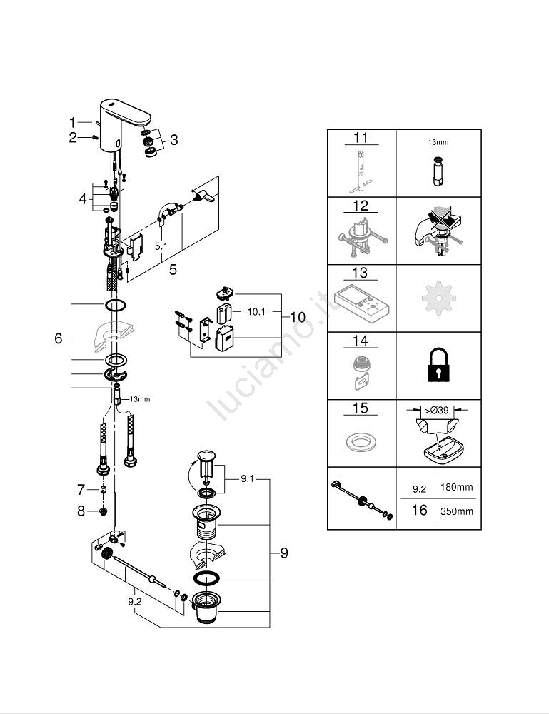 • Rubinetto per lavabo senza contatto con sensore a infrarossi per monitoraggio, impostazioni e operazioni di assistenza.