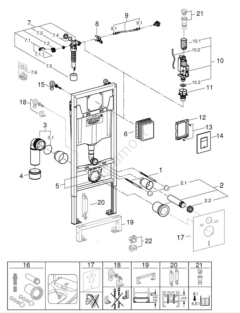 • Set completo 3 in 1 per WC sospeso, comprensivo di modulo di installazione, pulsante di comando e materiale di fissaggio.